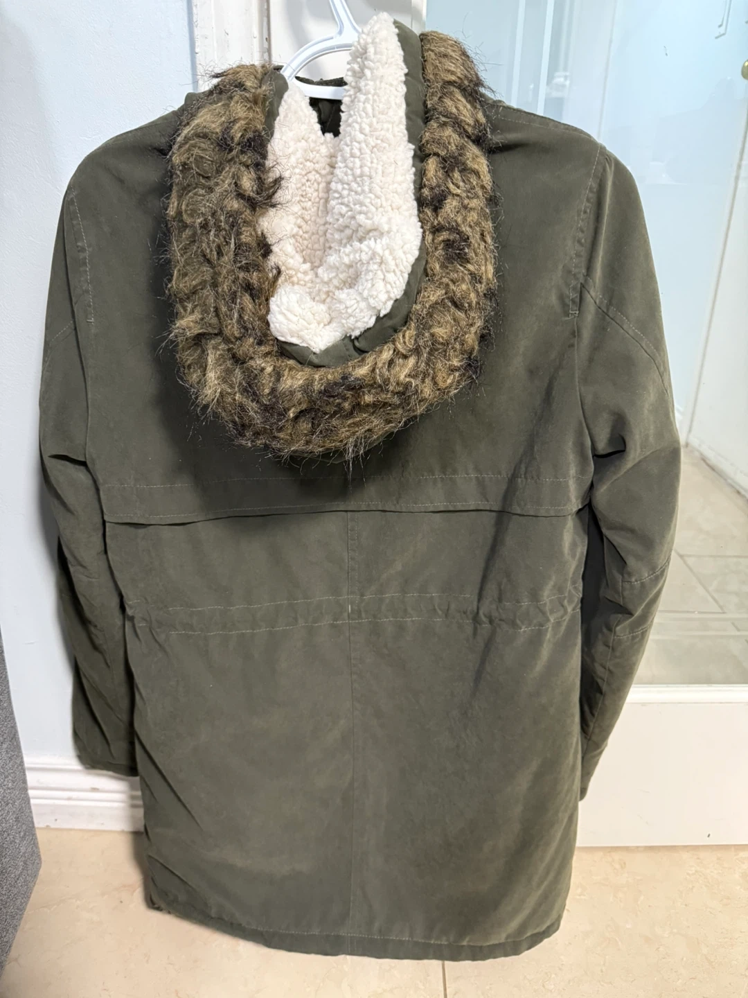 Olive green anorak parka jacket with a faux fur-lined hood. It features a drawstring waist and zippered pockets. This jacket is size XS.
