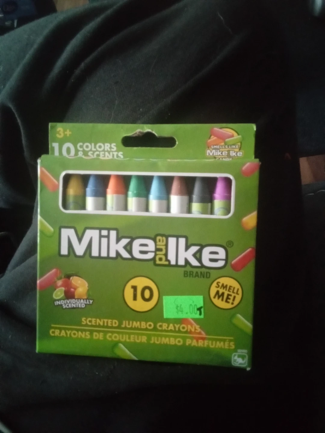 This is a set of 10 scented jumbo crayons by Mike and Ike. They're individually scented and have a vibrant smell. The crayons are suitable for ages 3 and up.