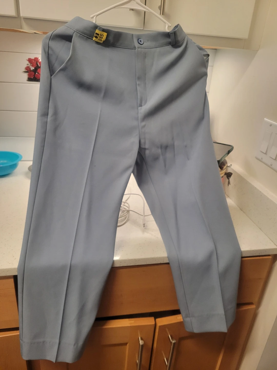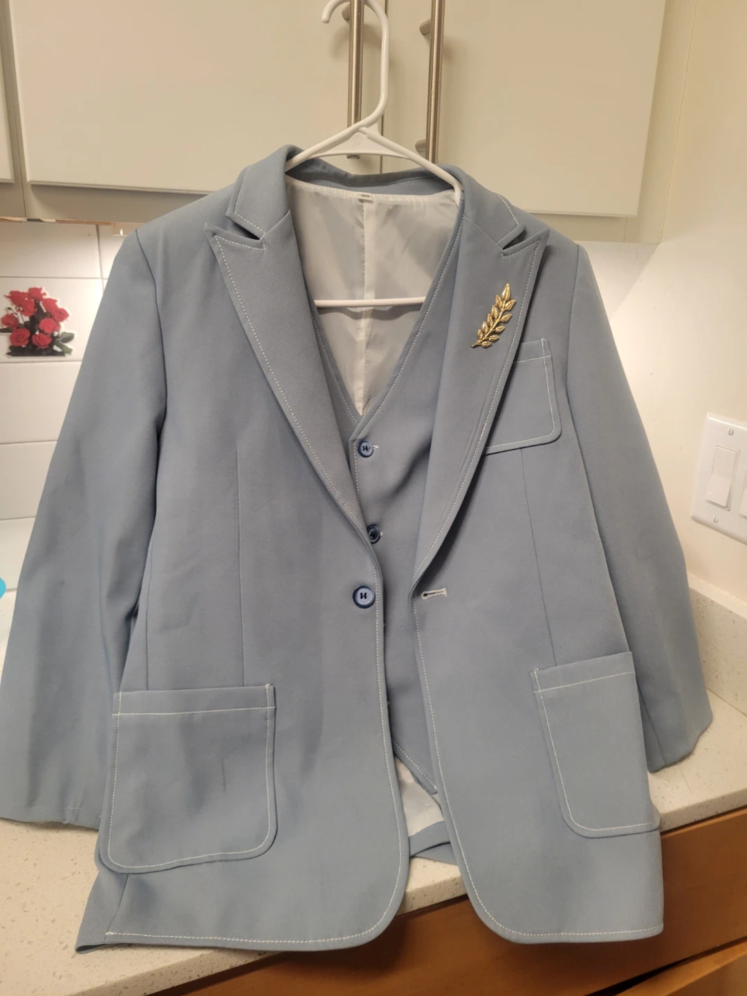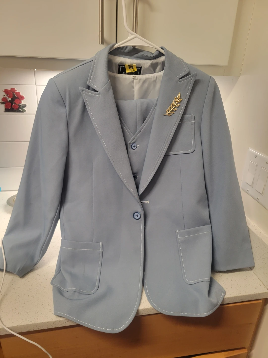 This is a light blue three-piece suit set including a jacket, vest, and pants. The suit features contrasting white stitching on the pockets and lapels. It also includes a decorative gold leaf lapel pin. This set is ready for your next formal occasion!