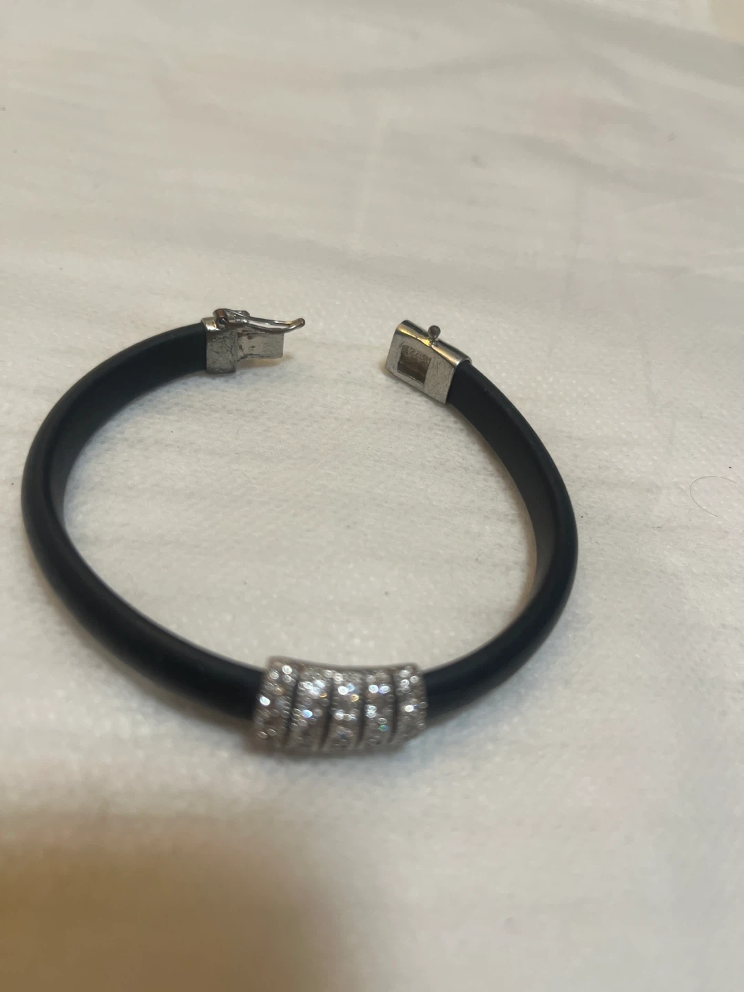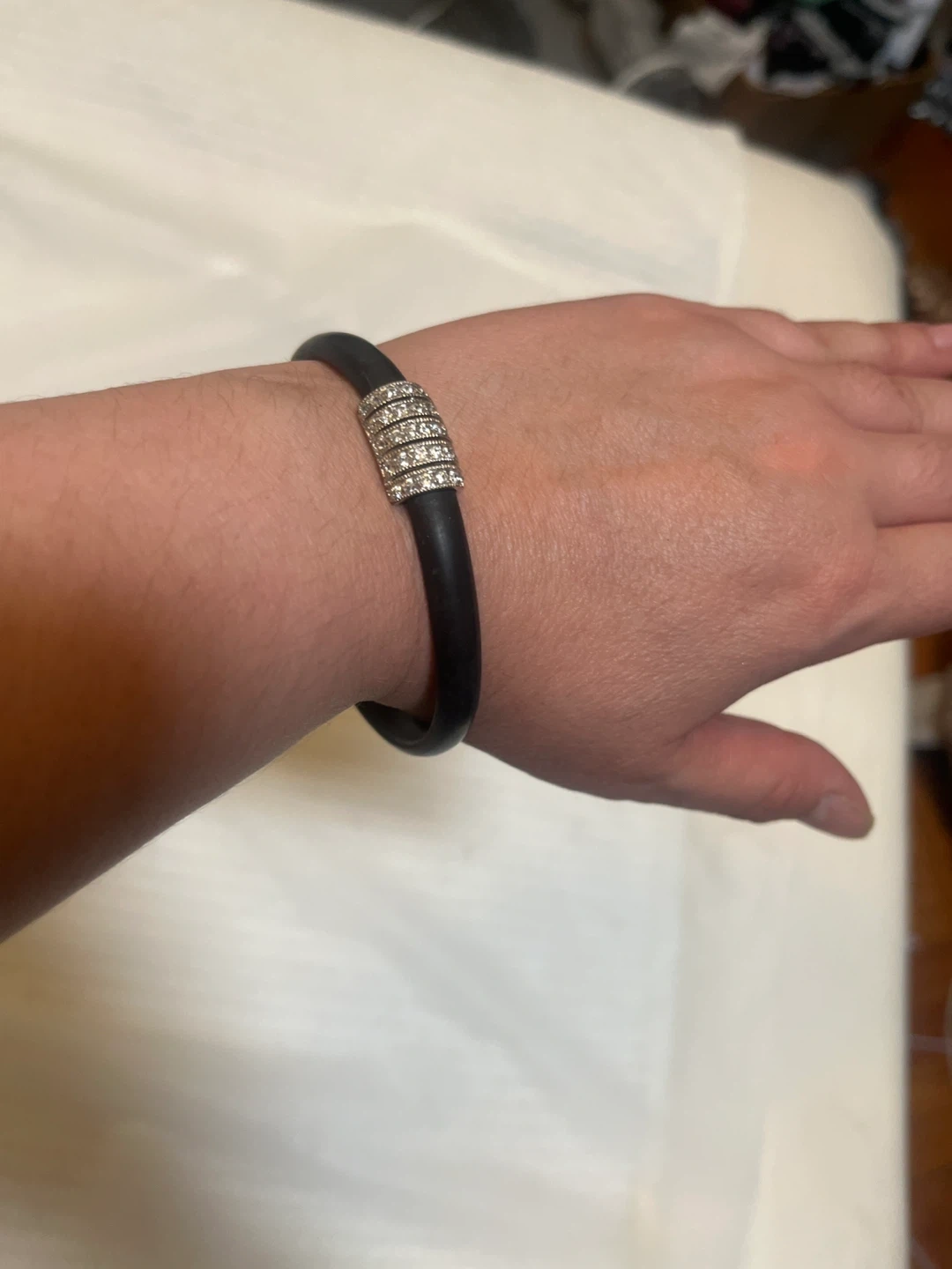 This black rubber bracelet features a decorative silver-toned accent with clear rhinestones. It has a secure clasp closure. It's a stylish accessory for everyday wear!