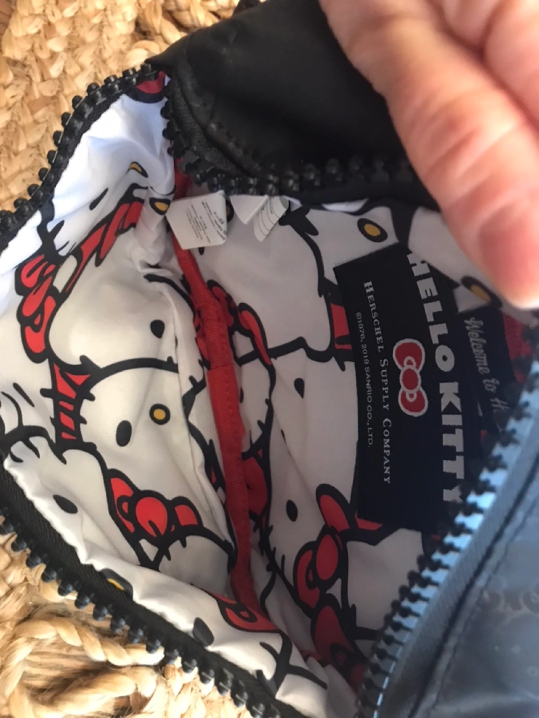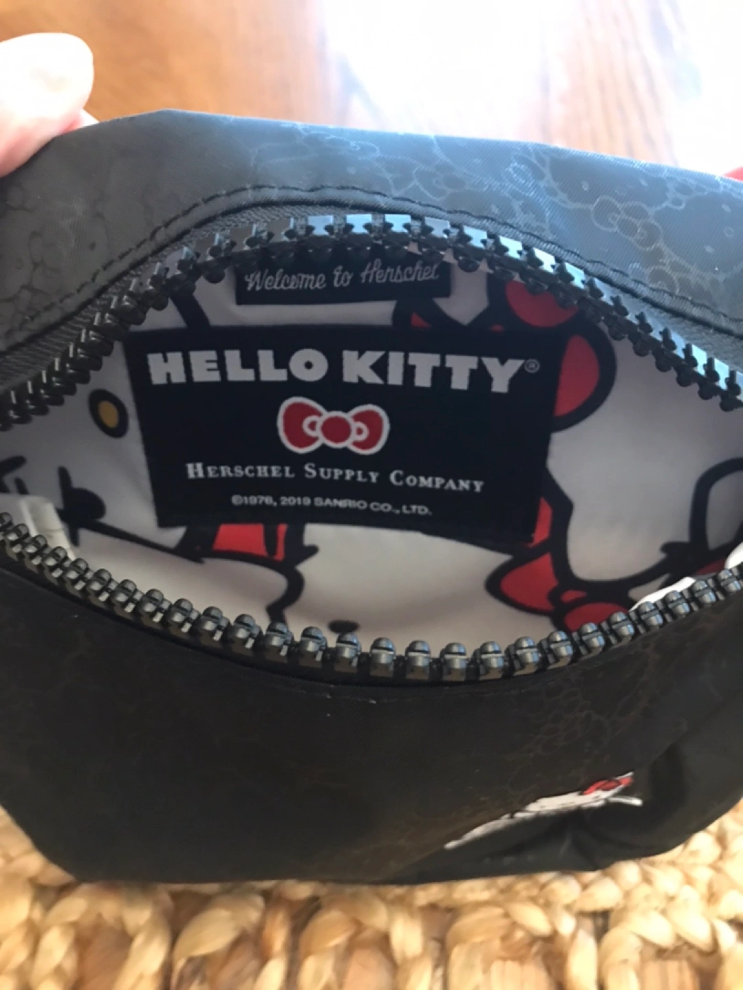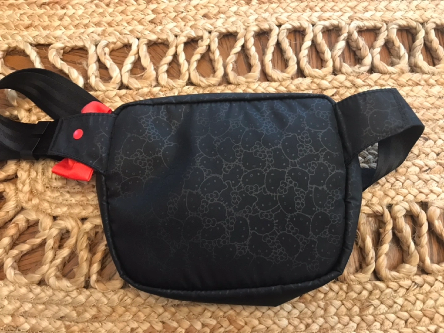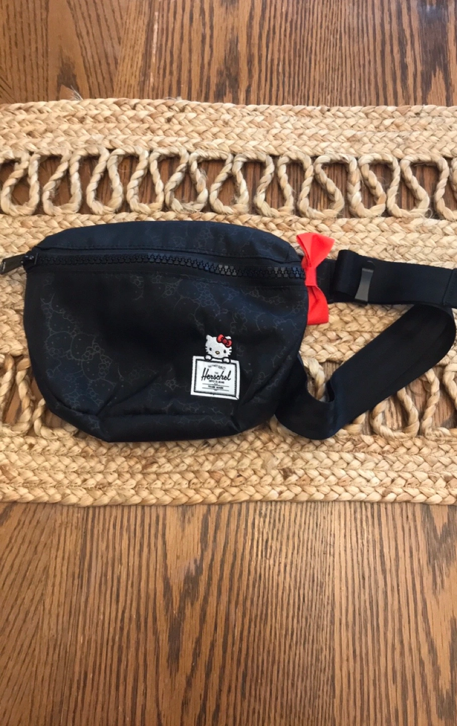 Black Herschel Supply Co. fanny pack with a Hello Kitty pattern. It features a zippered main compartment and an adjustable strap. This pack is great for keeping essentials close at hand!