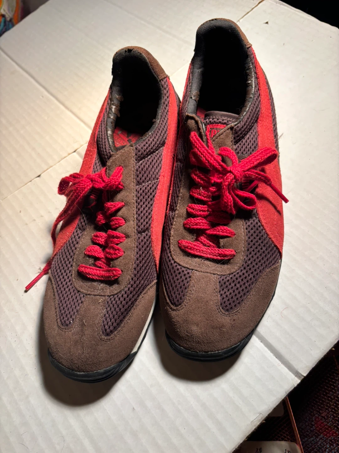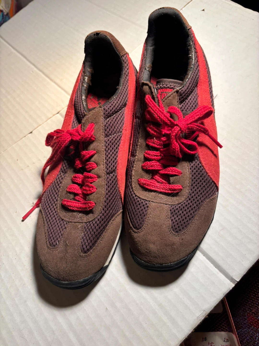 These Puma soccer shoes are gorgeous and sturdy – they are brand new but the vinyl at the entry is peeling from the age. Made with a mix of suede and mesh. They feature a durable rubber sole with a unique tread pattern. Red laces and detailing add a pop of color.