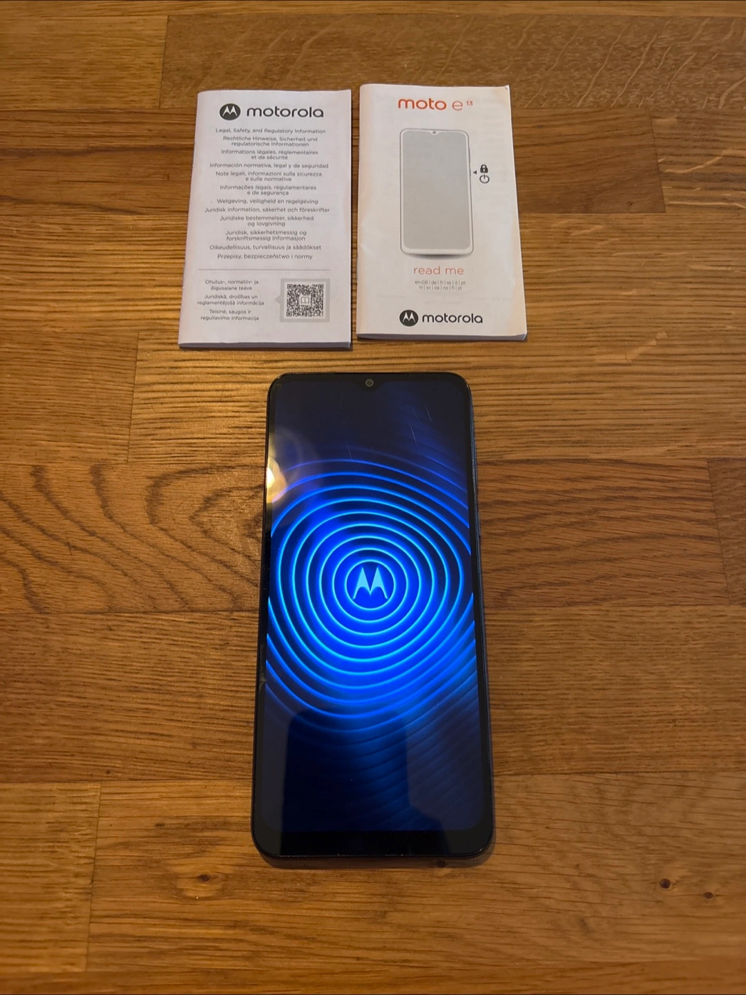 Selling a Motorola Moto E13 in good condition! It comes with the charging cable and instructions. Small superficial scratch on outside.
