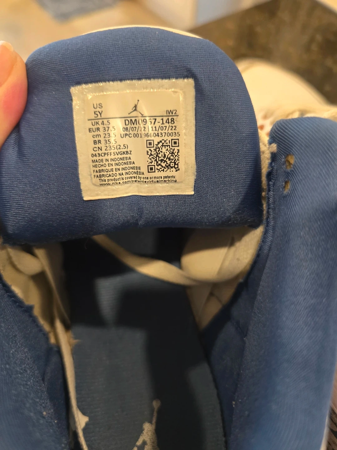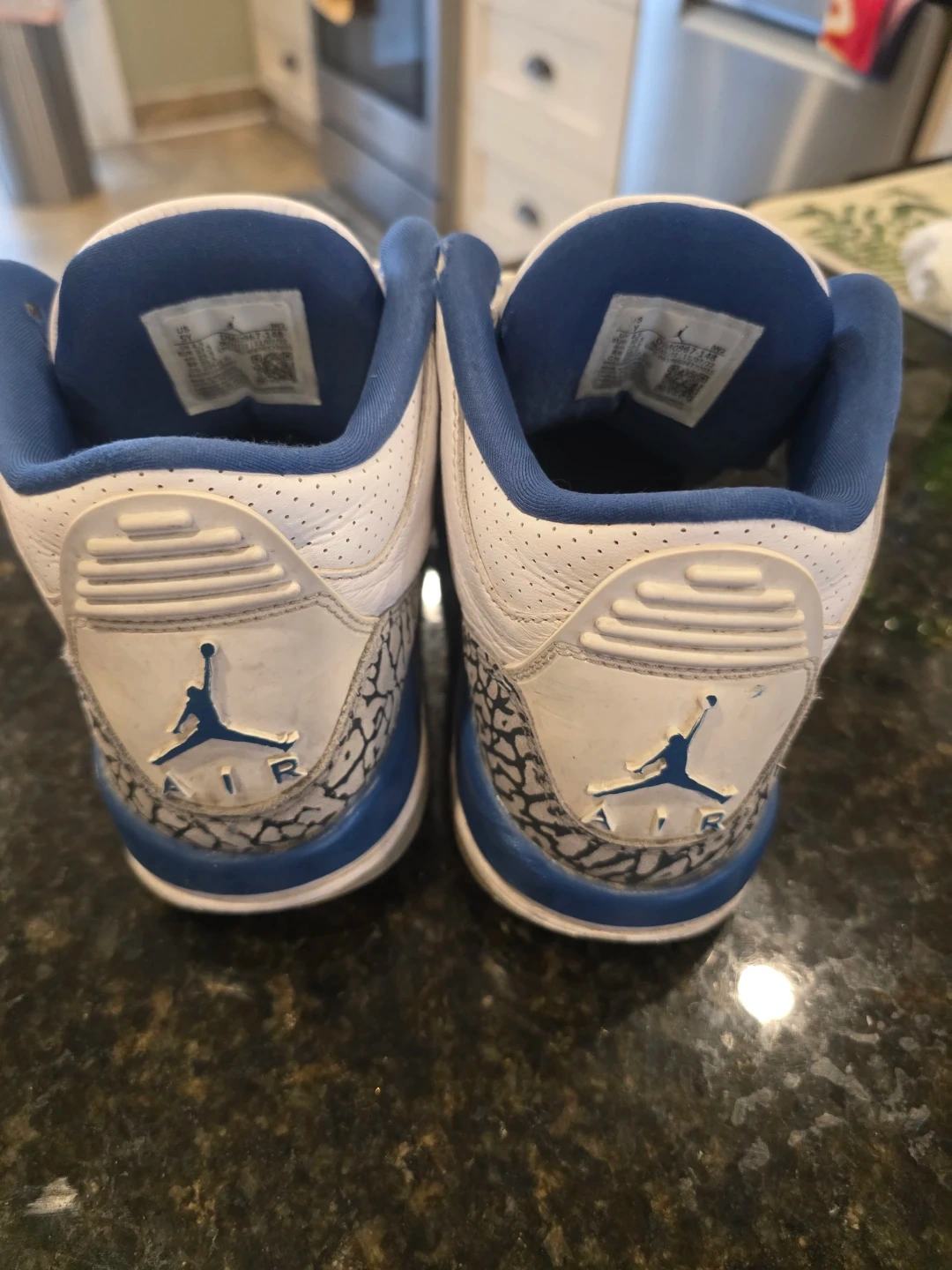 Selling a pair of Air Jordan 3 Retro in white and blue. They are in used condition, as shown in the photos. The size is US 5Y, UK 4.5, EUR 37.5, CM 23.5.