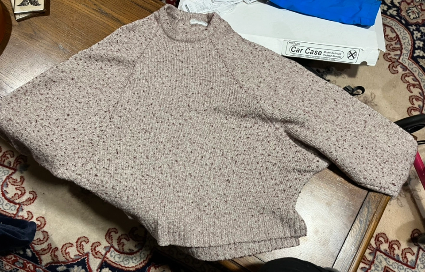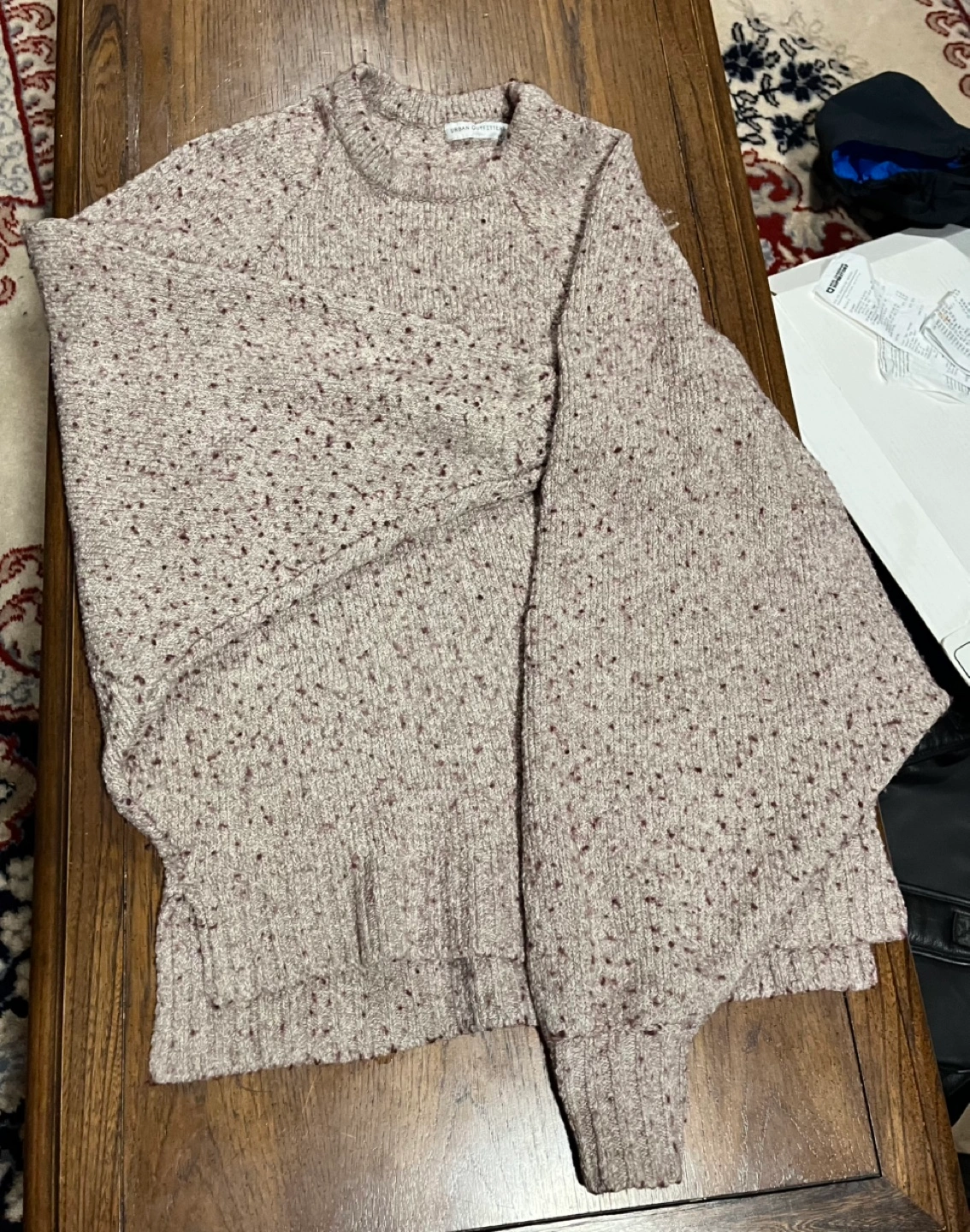 Cozy tan coloured with burgundy flecks, batwing-sleeved sweater. Don’t see a size but between small and medium. Relaxed fit.