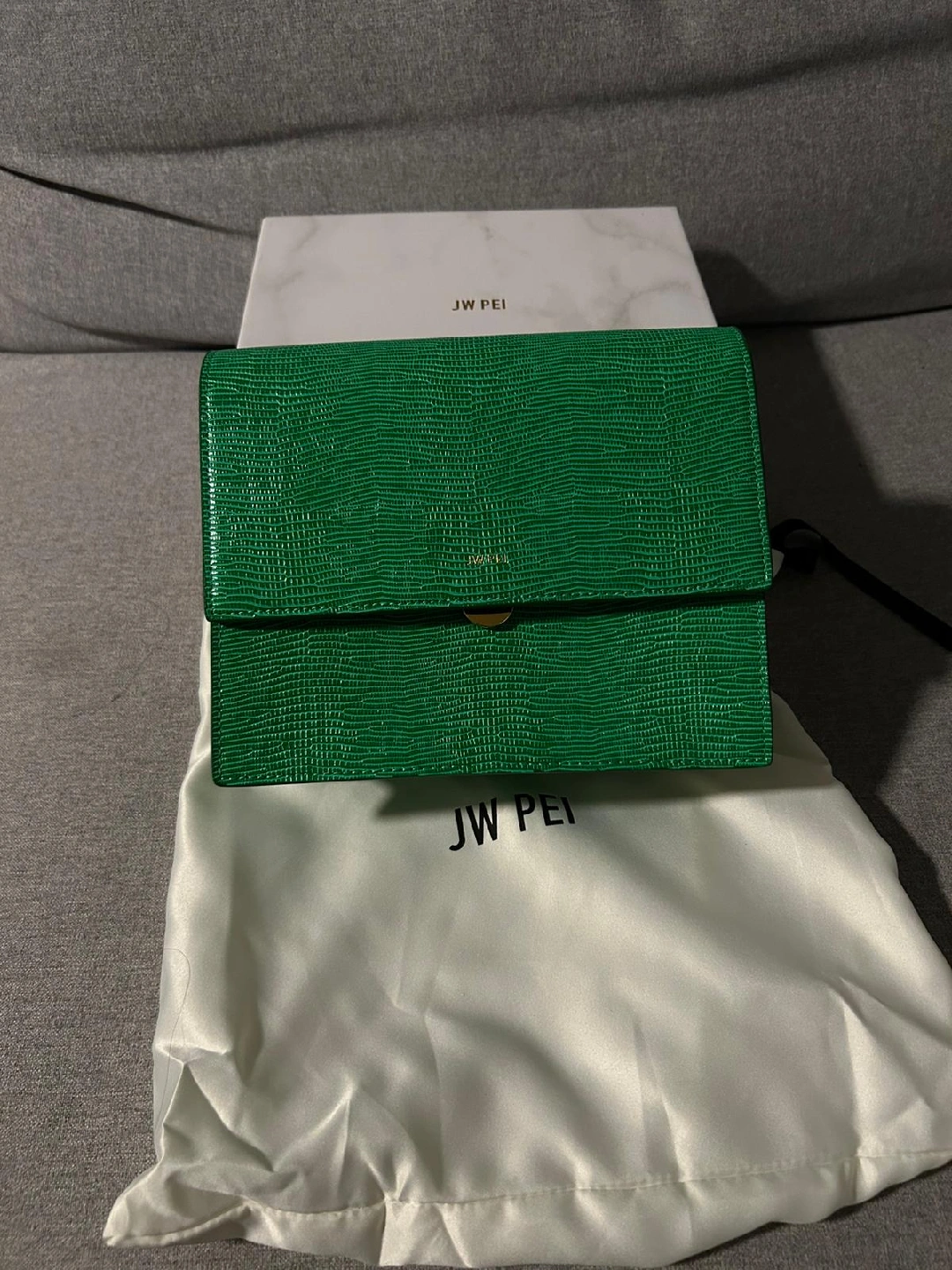 Selling a JW PEI bag in a vibrant green lizard texture! It comes with its original box and dust bag. This stylish bag is perfect for adding a pop of colour to any outfit. The unique lizard texture makes it a real standout piece!