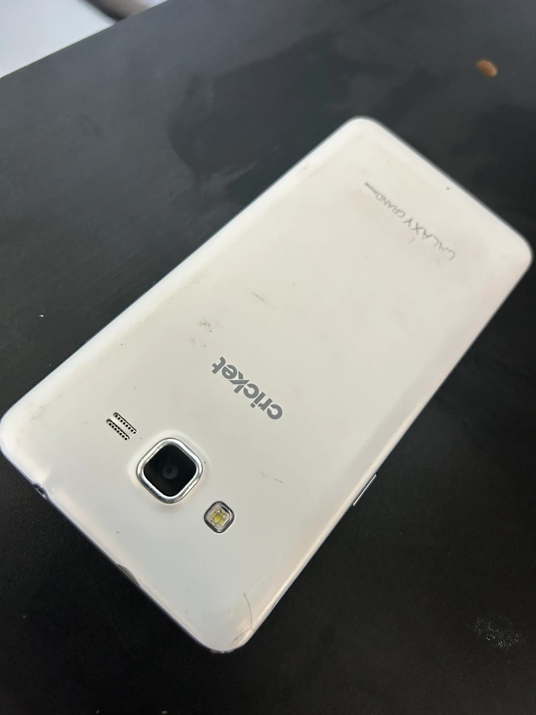 Samsung Galaxy Grand Prime smartphone in white. It's a Cricket Wireless phone. Shows signs of normal wear and tear.