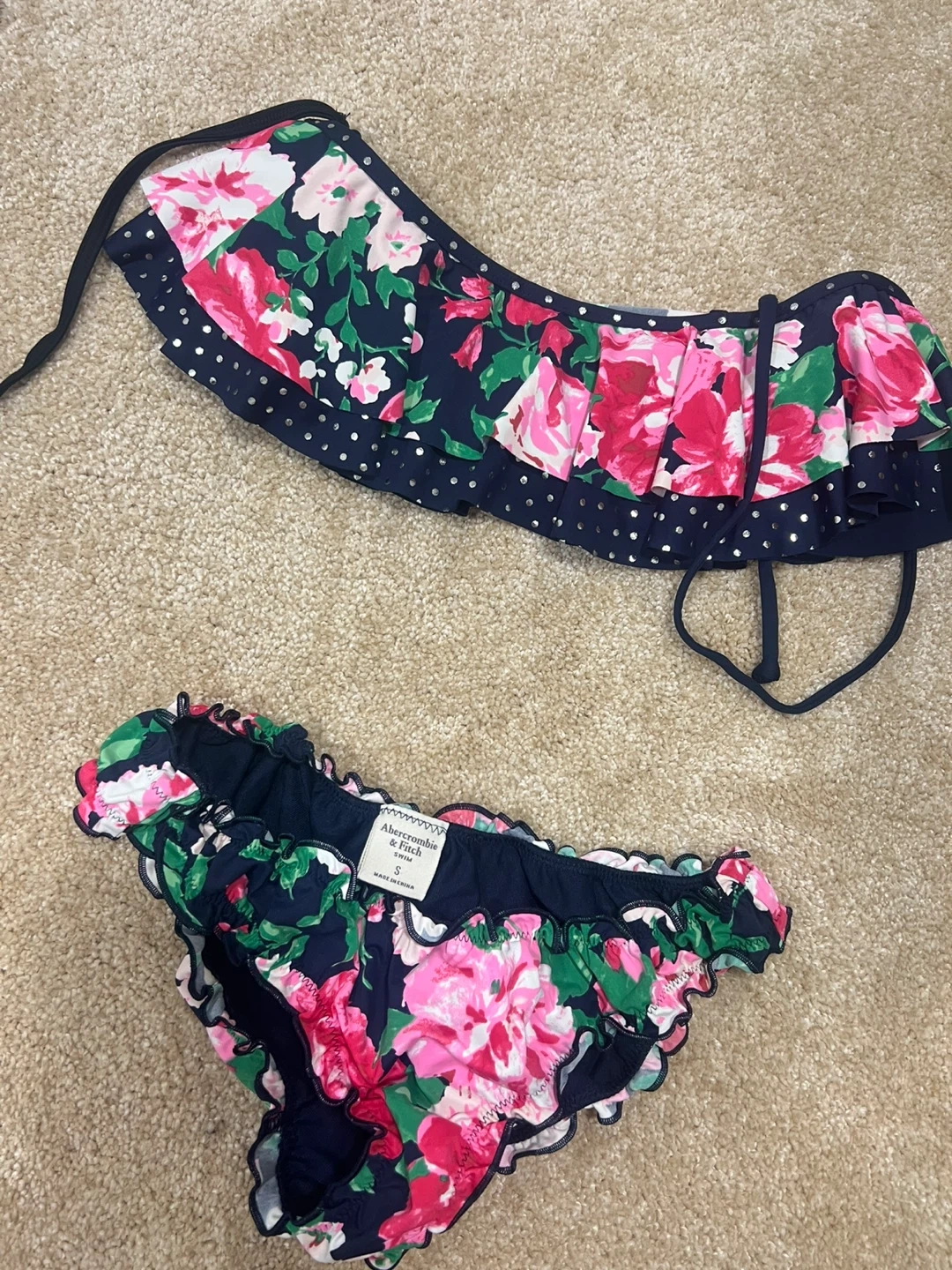 Cute floral print bikini set from Abercrombie & Fitch. Includes a ruffled bandeau top and matching bikini bottoms. Size is S.