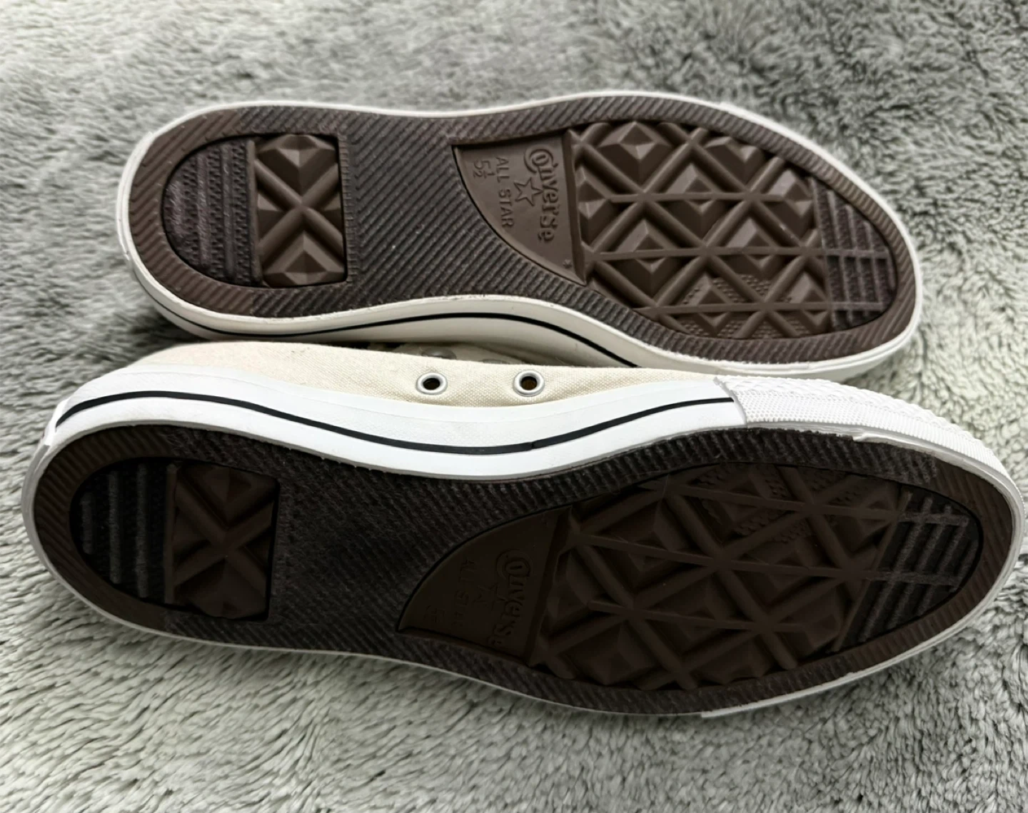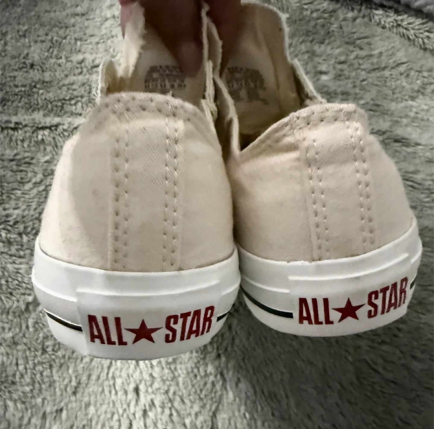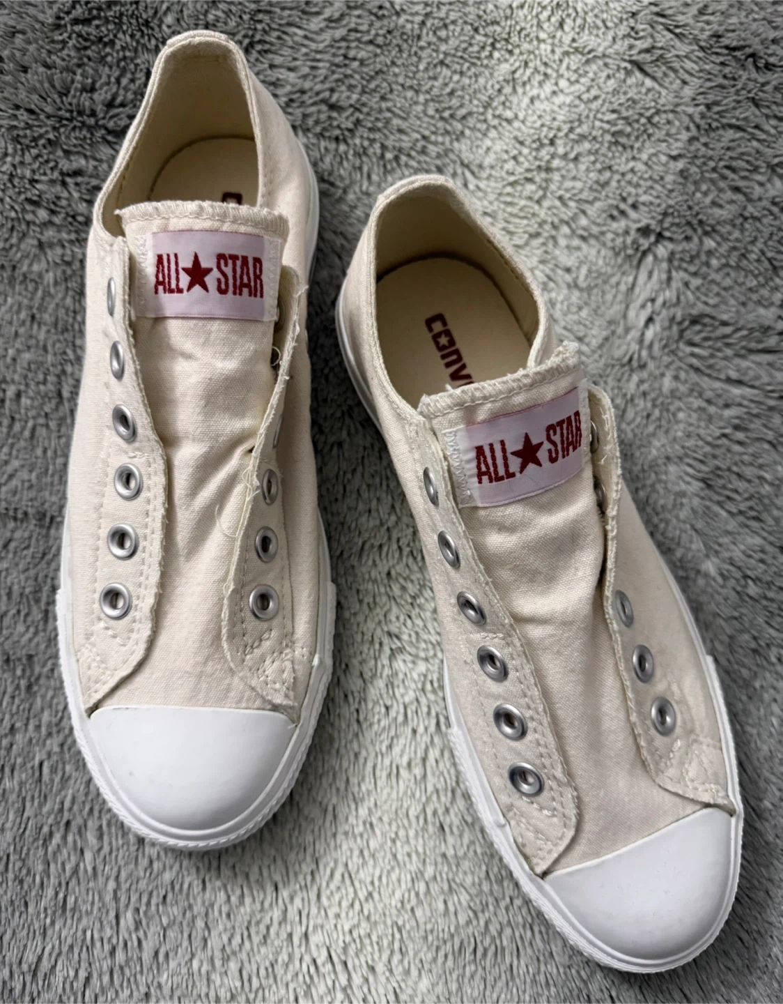 Cream canvas Converse All Star sneakers. These low-top shoes are made with a durable canvas upper and a rubber sole. They're slip-on style and come with metal eyelets. A classic casual shoe!