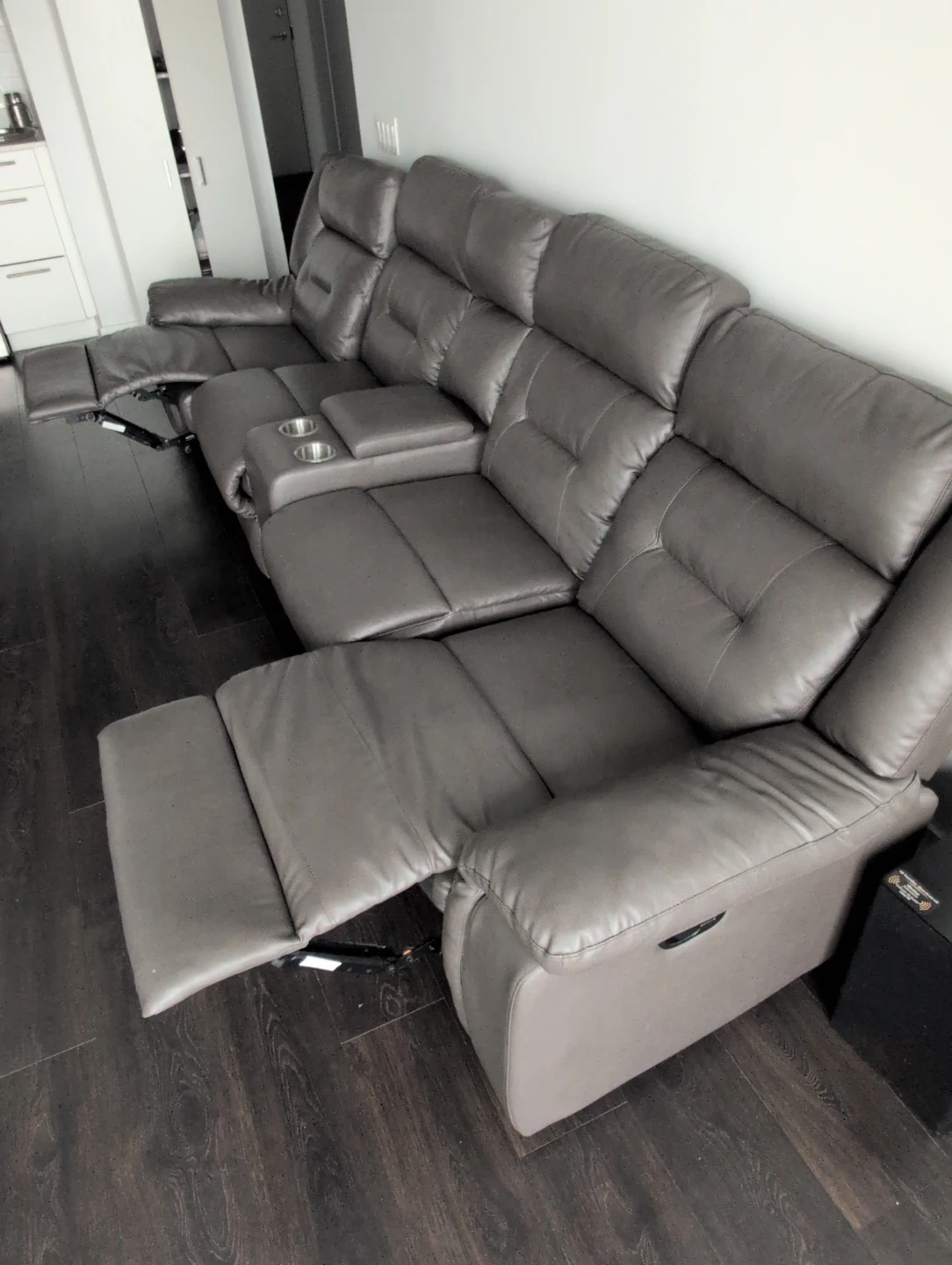 This is a three-seater reclining sofa in a grey leather-look material. It features built-in cup holders in the centre console for convenience. All seats recline, offering a comfortable way to relax. It's a great addition to any living room or home theatre setup!