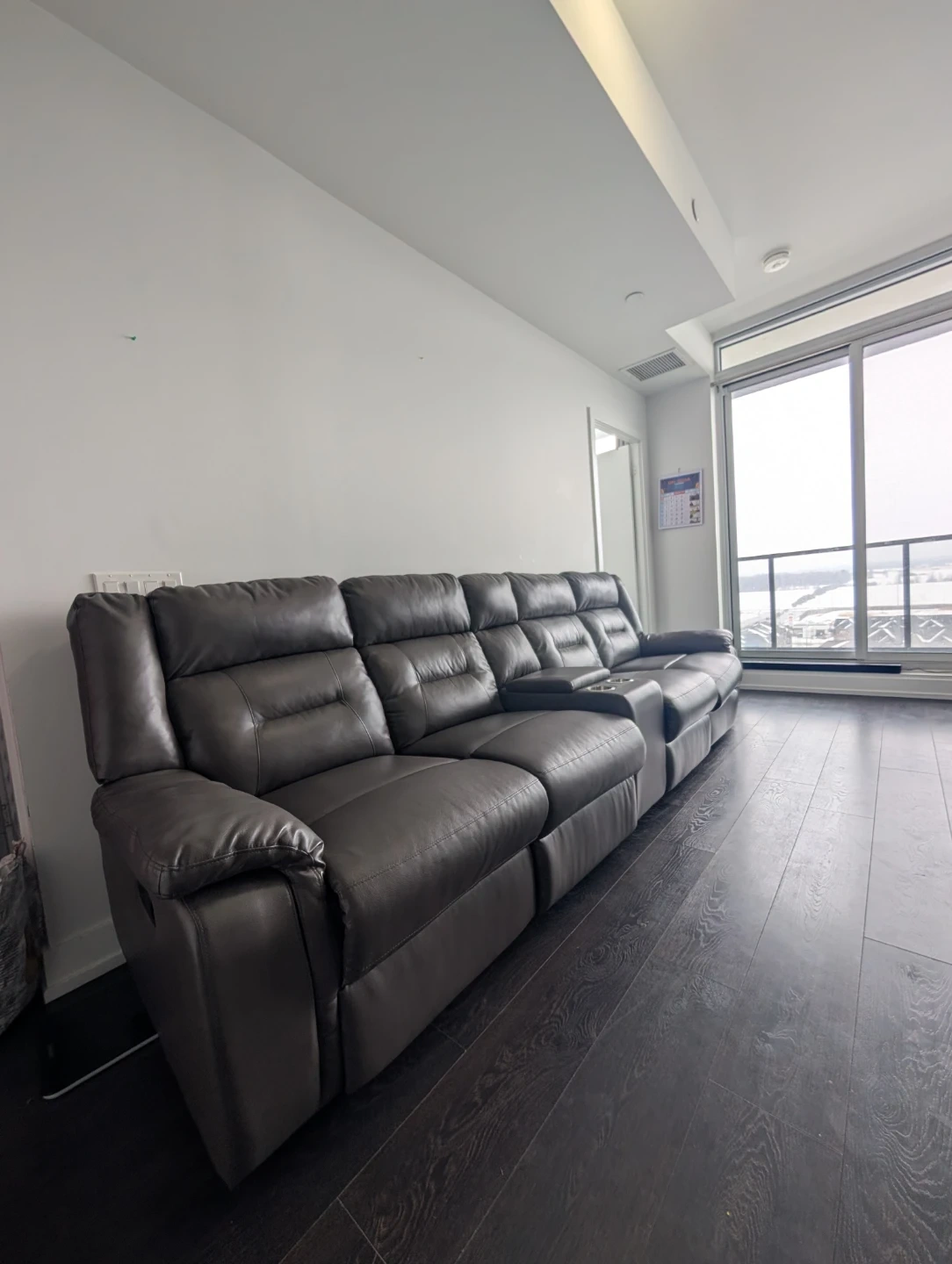Grey Leather Reclining Sofa with Cup Holders