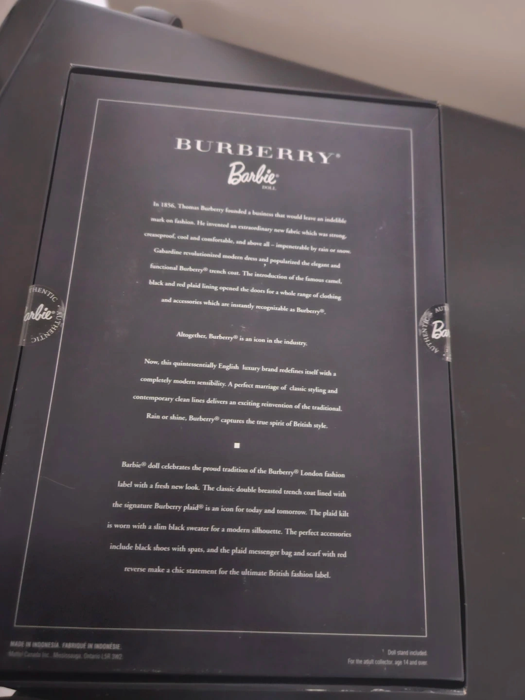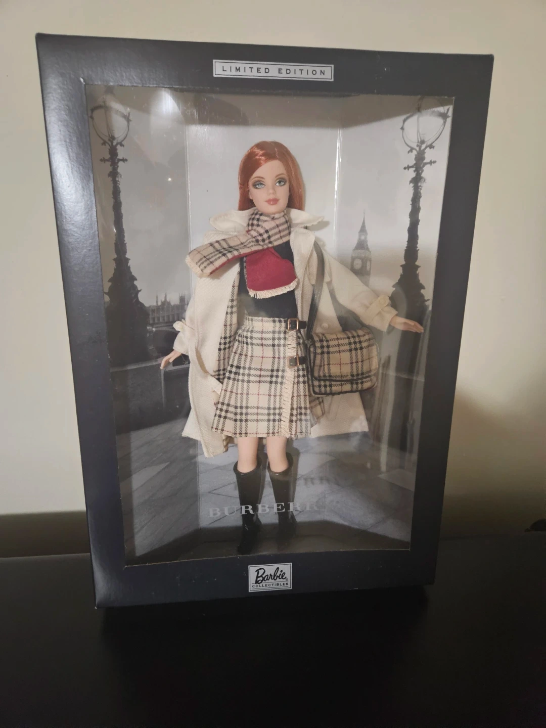 This is a limited edition Barbie doll highly collectible, red-haired wearing trench coat, plaid skirt, scarf, and handbag. The doll comes in its original packaging. Sealed.