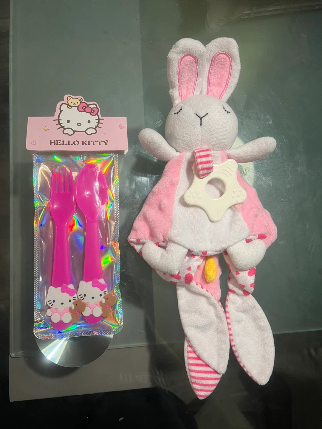 This is a Hello Kitty themed pink fork and spoon set. It comes with a likely new teething ring attached to a plush bunny. Perfect for little ones starting to self-feed!