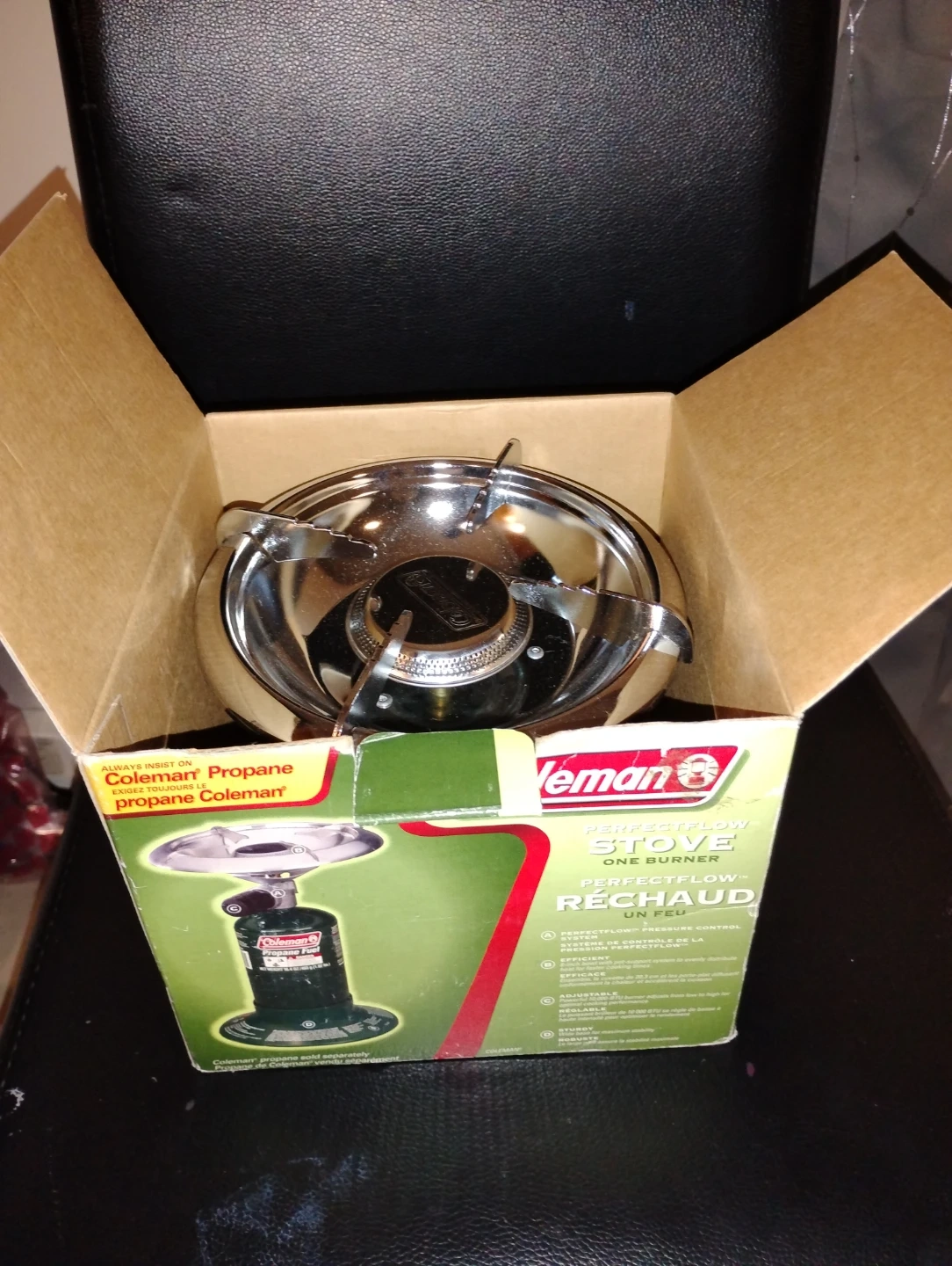 This is a Coleman PerfectFlow one-burner propane stove. It features a PerfectFlow pressure control system for consistent performance. The burner is adjustable to control heat output.