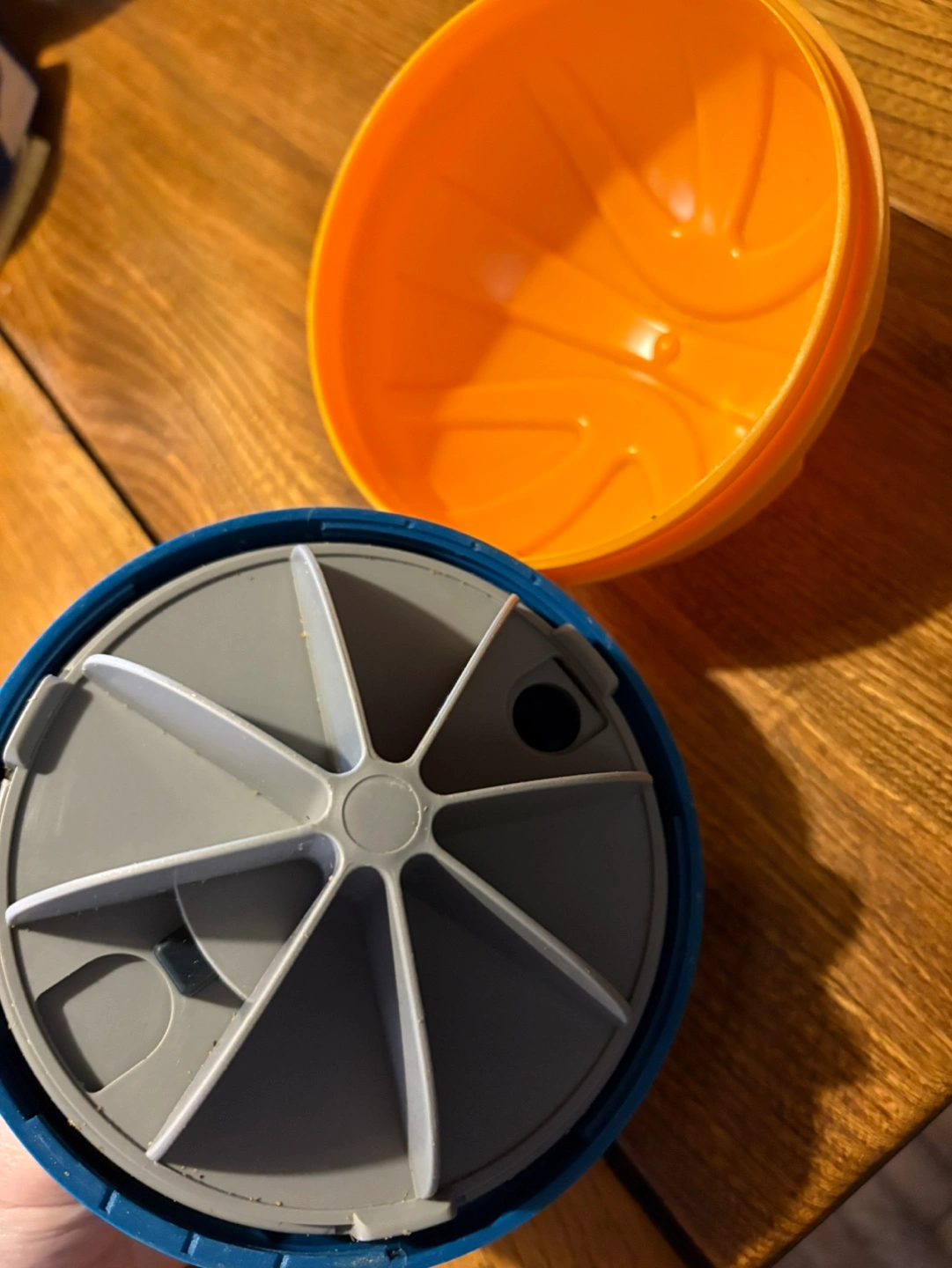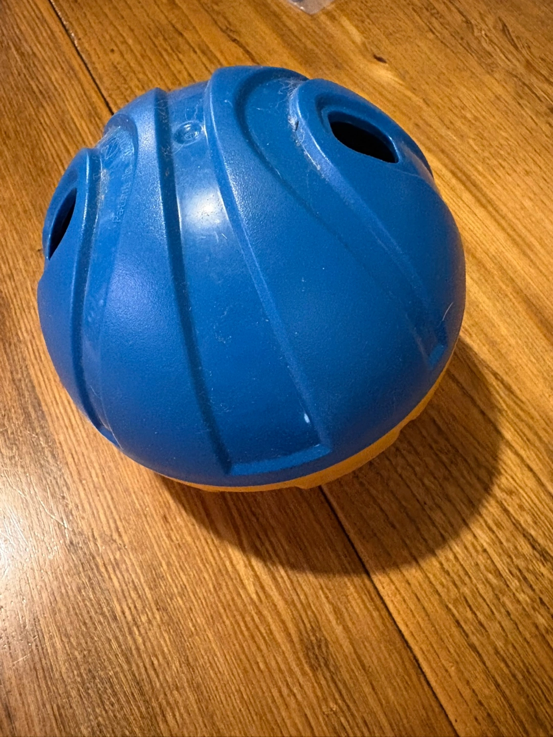 Durable plastic dog toy. Two halves, blue and orange. Treat dispensing compartments. Good for puzzle play. Makes a sound when rolling around and can change the dispensing level from easy to hard.