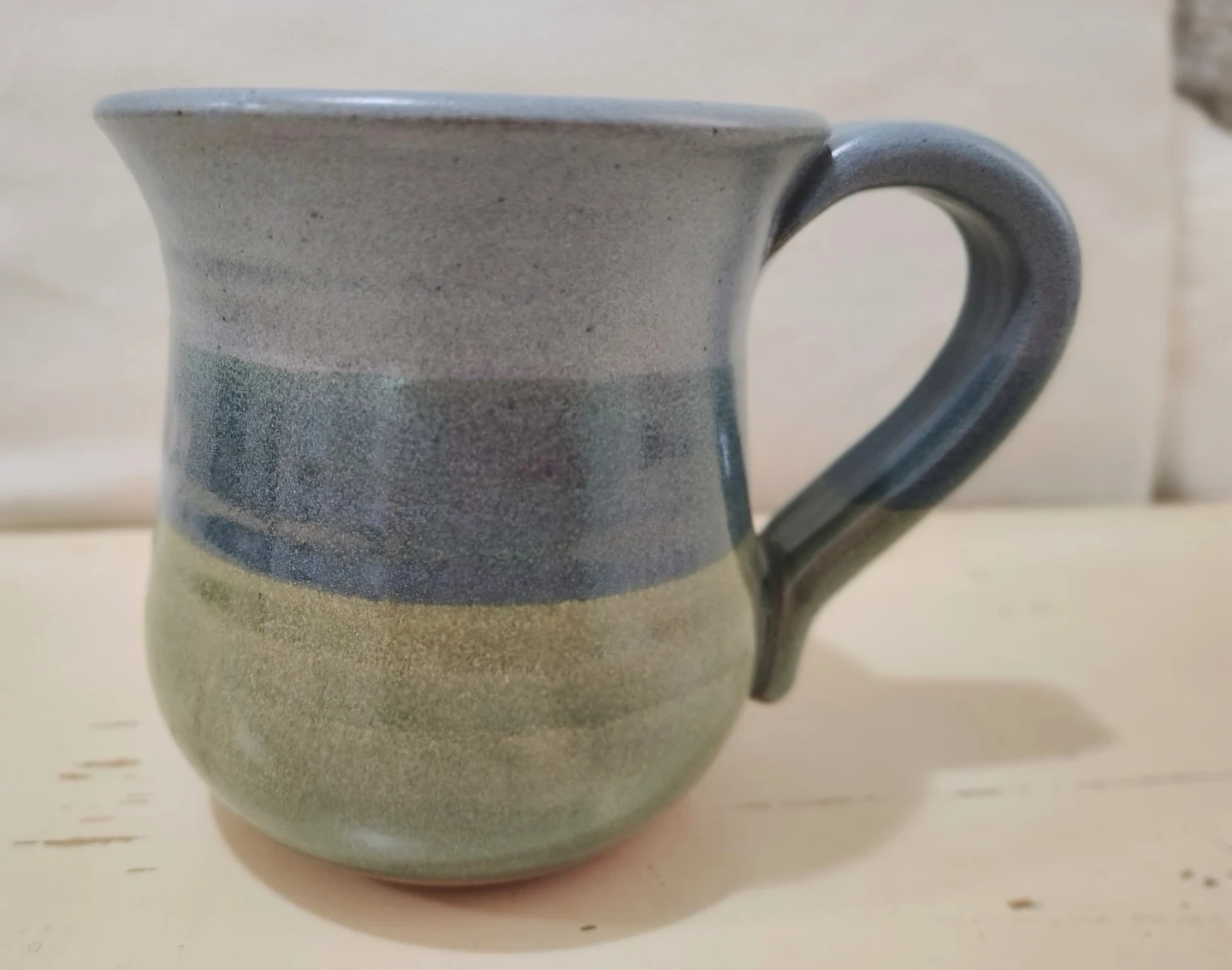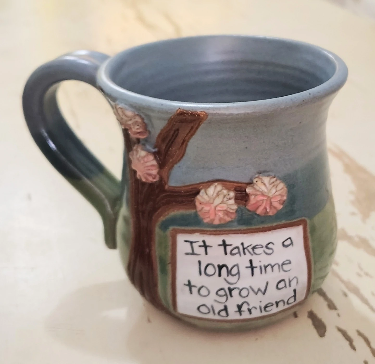 Uncommon goods hand made/painted 14 oz. stonewear clay mug (lead free glaze). Cherry blossoms sprout from base. "It takes a long time to grow an old friend' 14 oz. Artist JoAnn Stratakos orig. $48, Microwave/dishwasher safe.