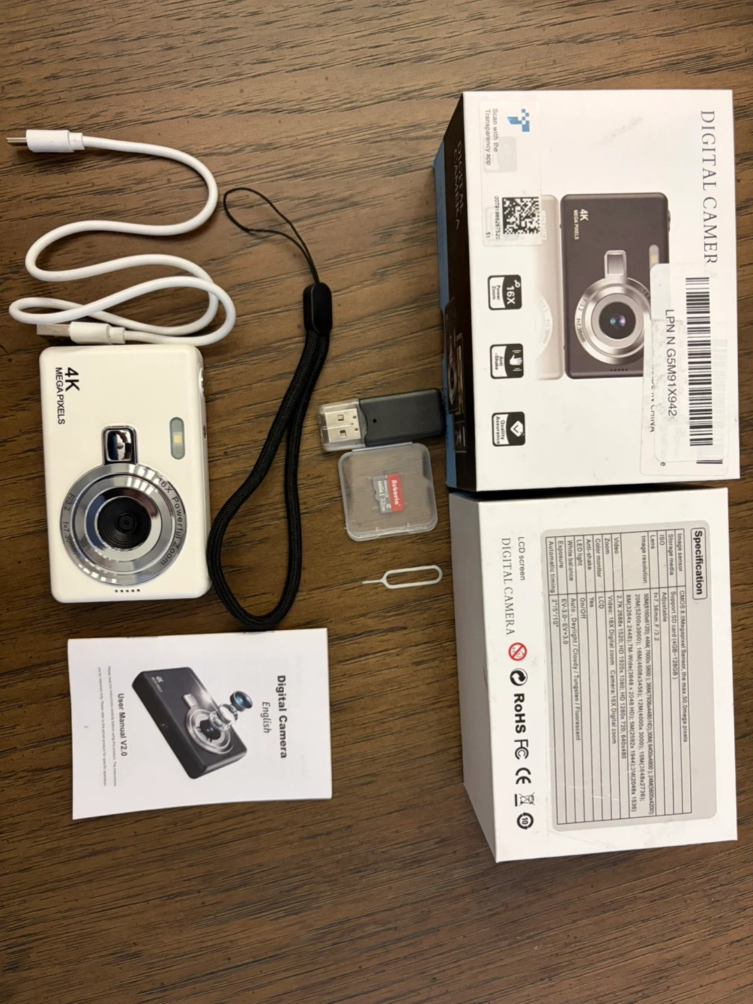 This is a digital camera with 4K resolution and 16x optical zoom. It includes a USB cable, wrist strap, 32GB SD card, and user manual. It also features anti-shake technology and face detection.