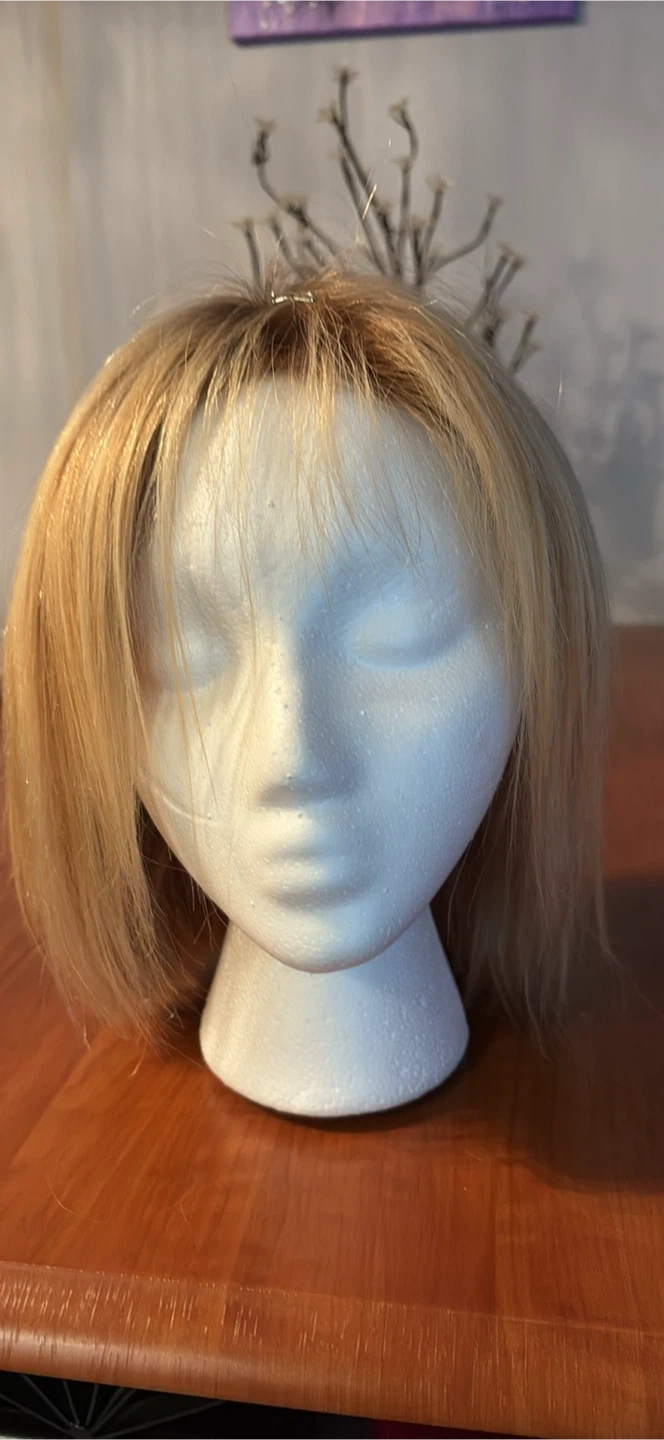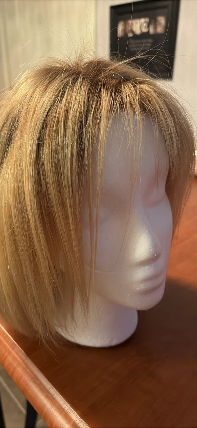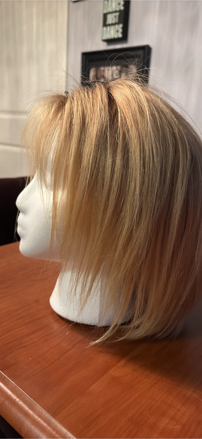 This is a shoulder-length blonde wig with bangs. It's styled in a bob cut. The hair is human hair, Worn approx 5 times…