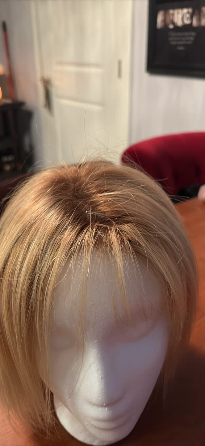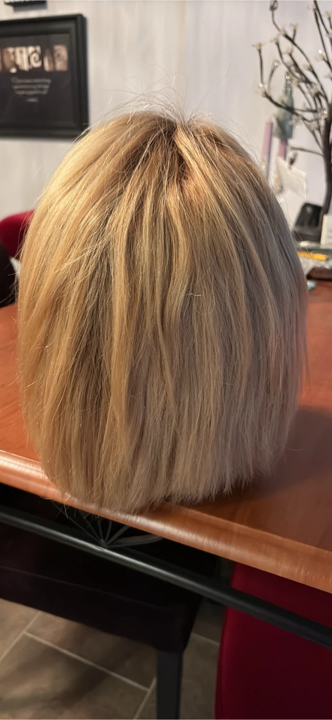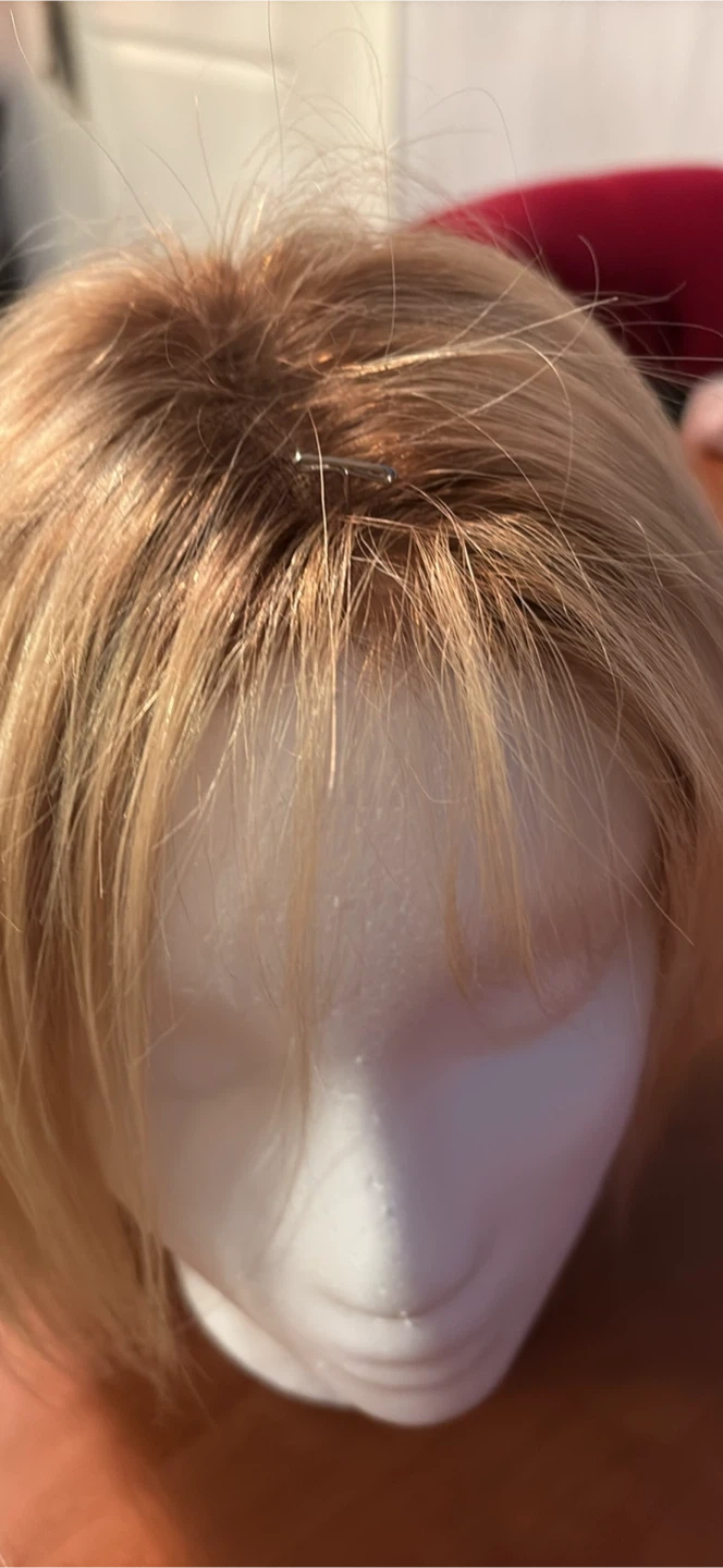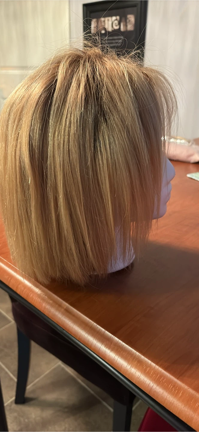 This is a shoulder-length blonde wig with bangs. It's styled in a bob cut. The hair is human hair, Worn approx 5 times…