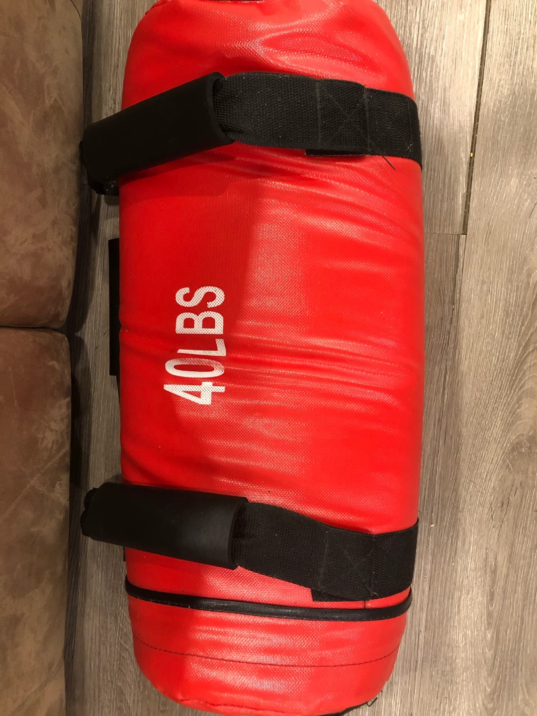 This red fitness sandbag weighs 40 lbs. It's made of durable material and has multiple handles for various exercises. Perfect for strength and conditioning workouts!
