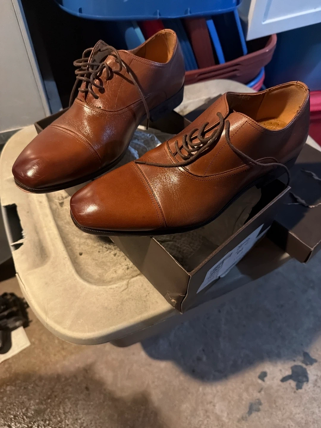 Florsheim Moores Oxford shoes in a rich brown leather. These dress shoes come in a size 8.5 3E. They're crafted from quality leather for a classic look.