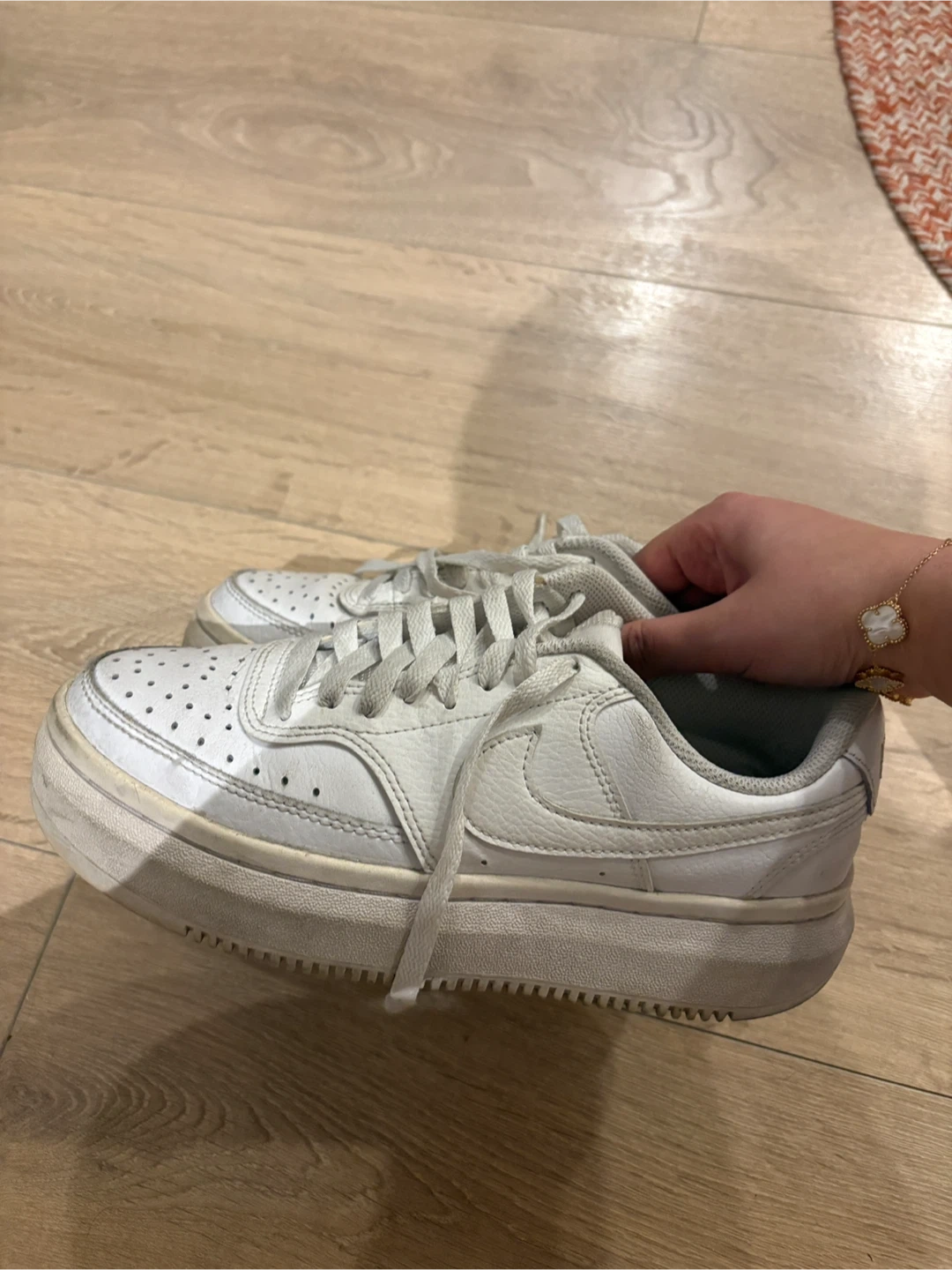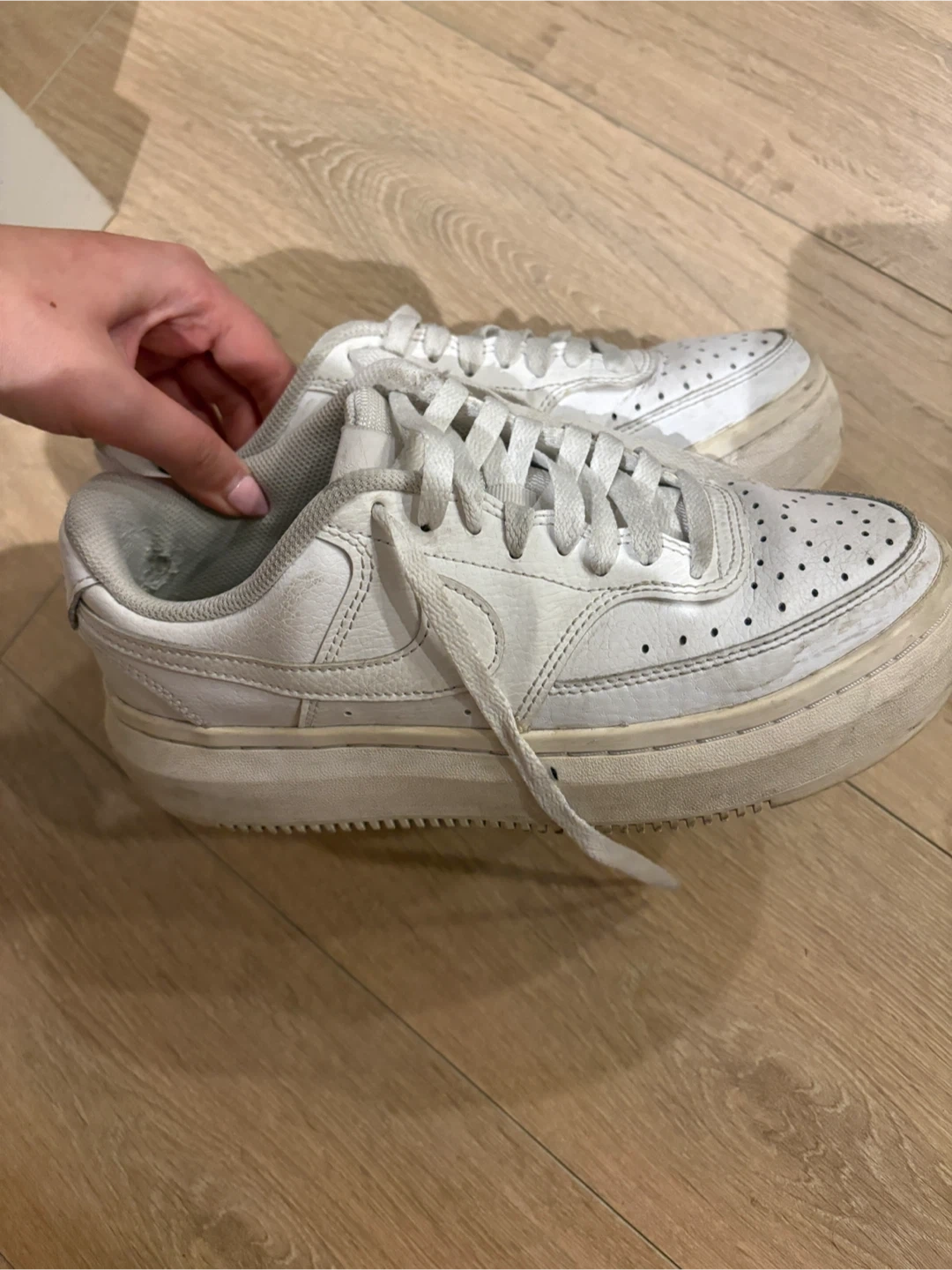These are a pair of white Nike Court Vision sneakers. They're made of leather with a rubber sole. This style is great for casual wear.