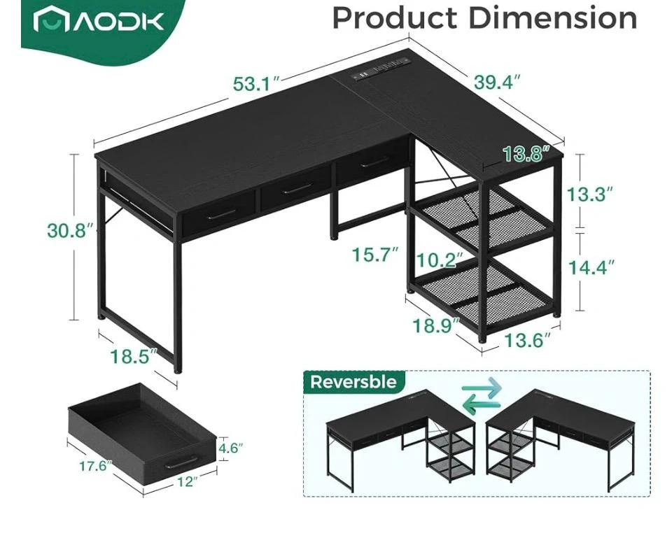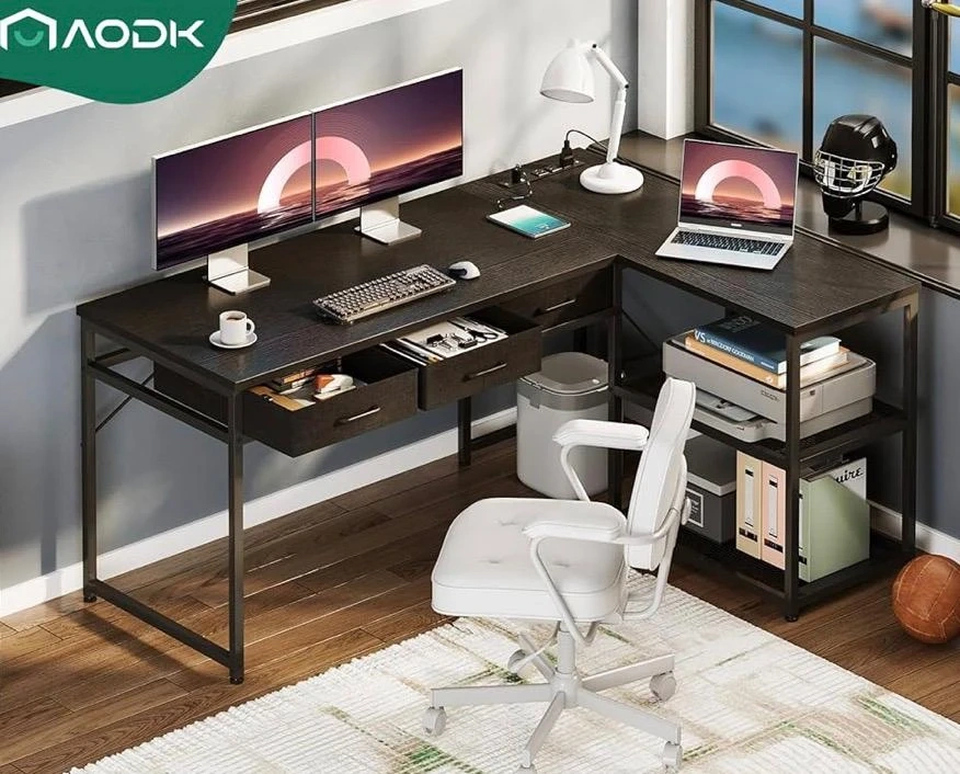AODK L-Shaped Desk with Storage Shelves and Drawers