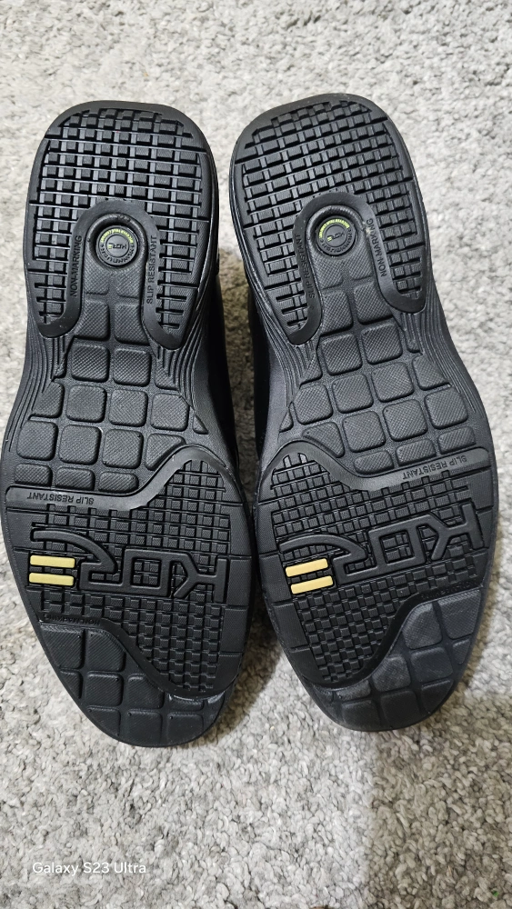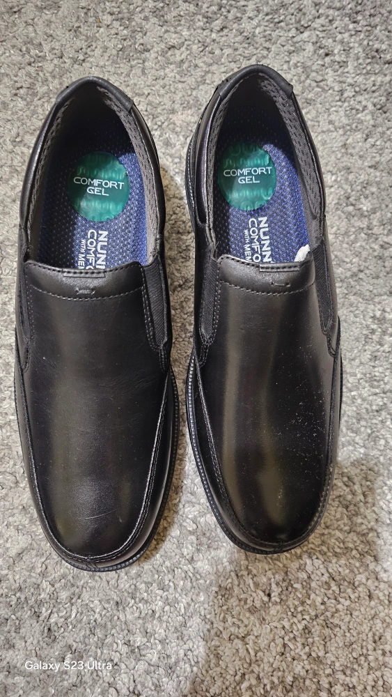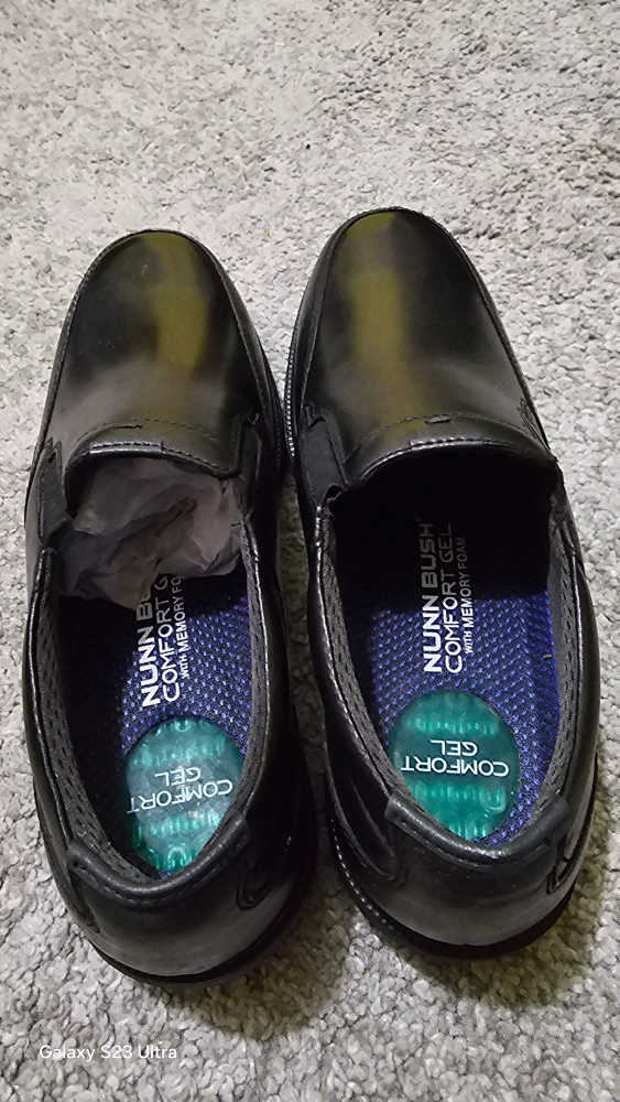 Selling a pair of Nunn Bush Kore slip-on shoes in black. They feature Comfort Gel with Memory Foam for extra comfort. These shoes are also slip-resistant, making them a great choice for work or everyday wear. Comes with the original box. shoe size 7 1/2.
