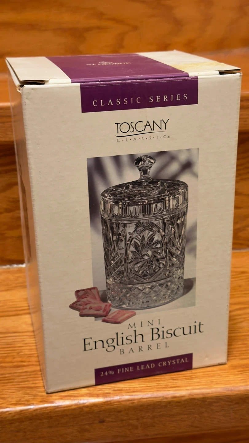 This is a mini English biscuit barrel from Tuscany's Classic Series. It's made from 24% fine lead crystal. This decorative jar is crafted in the USA.