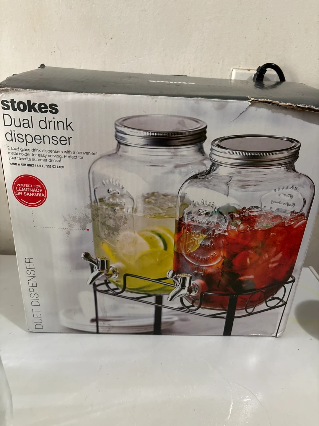 Selling a Stokes dual drink dispenser that's practically brand new! It features two solid glass drink dispensers with a convenient metal holder, perfect for your favourite summer drinks. Each dispenser holds 4.6 L / 1.35 US gal. The box is included!
