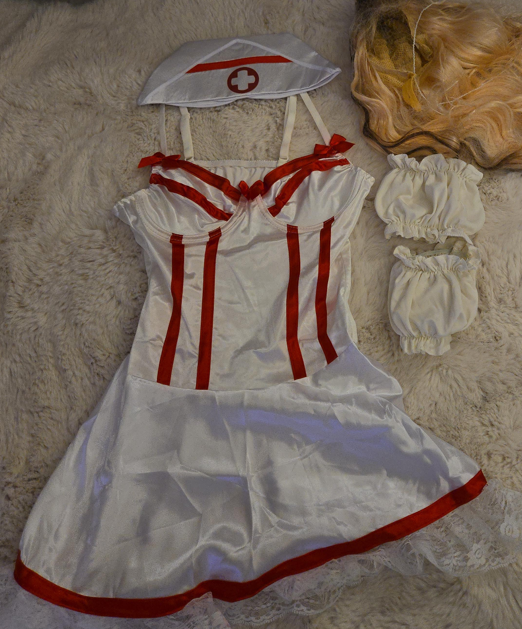 60Selling a nurse costume set that includes a dress with red stripes, and a nurse hat. It also comes with a blonde wig to complete the look! Perfect for a costume party or event