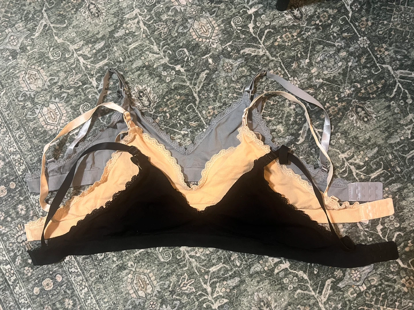 37Selling a set of three nursing bras in black, beige, and grey colours. Size medium. Price is for all
