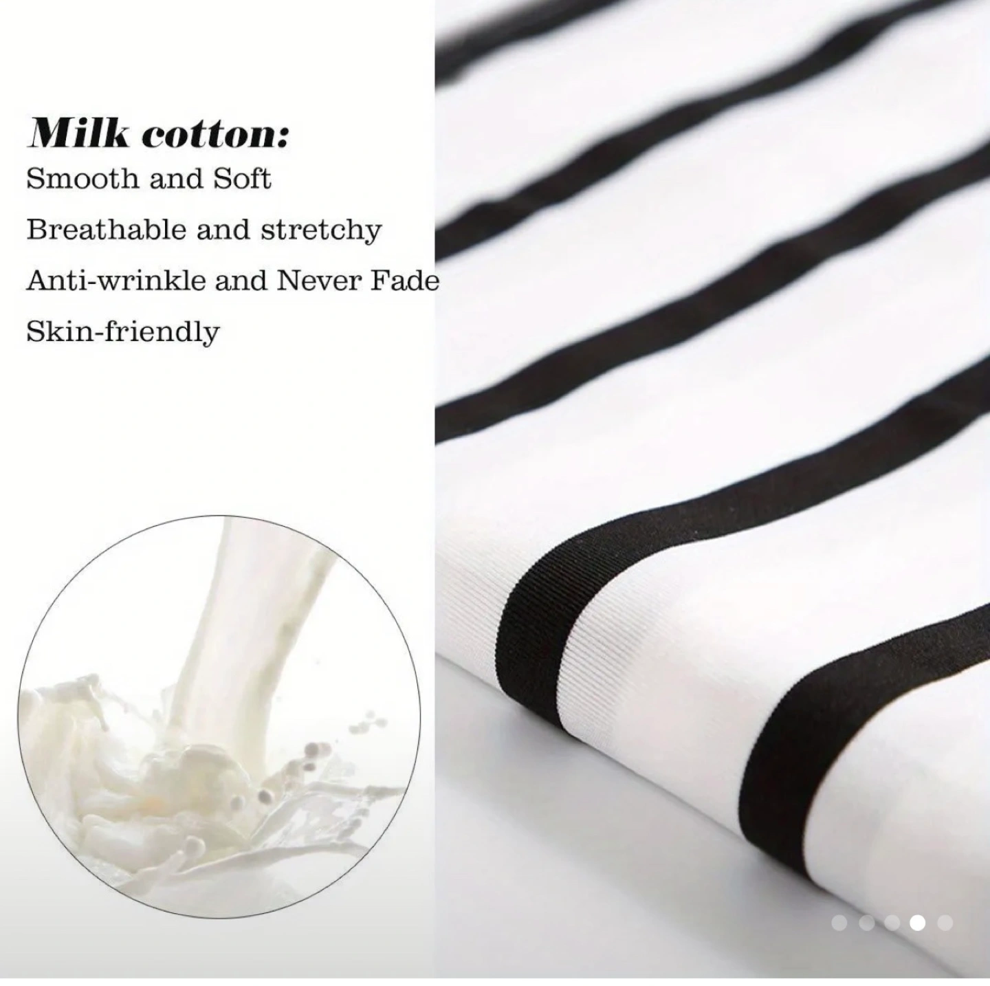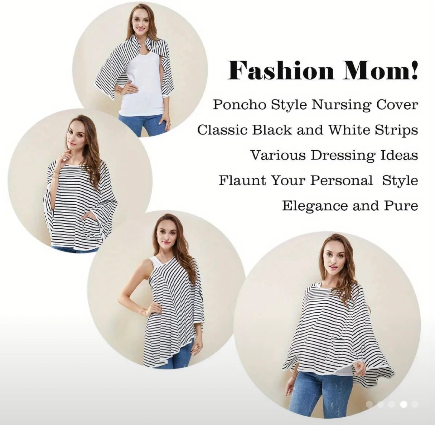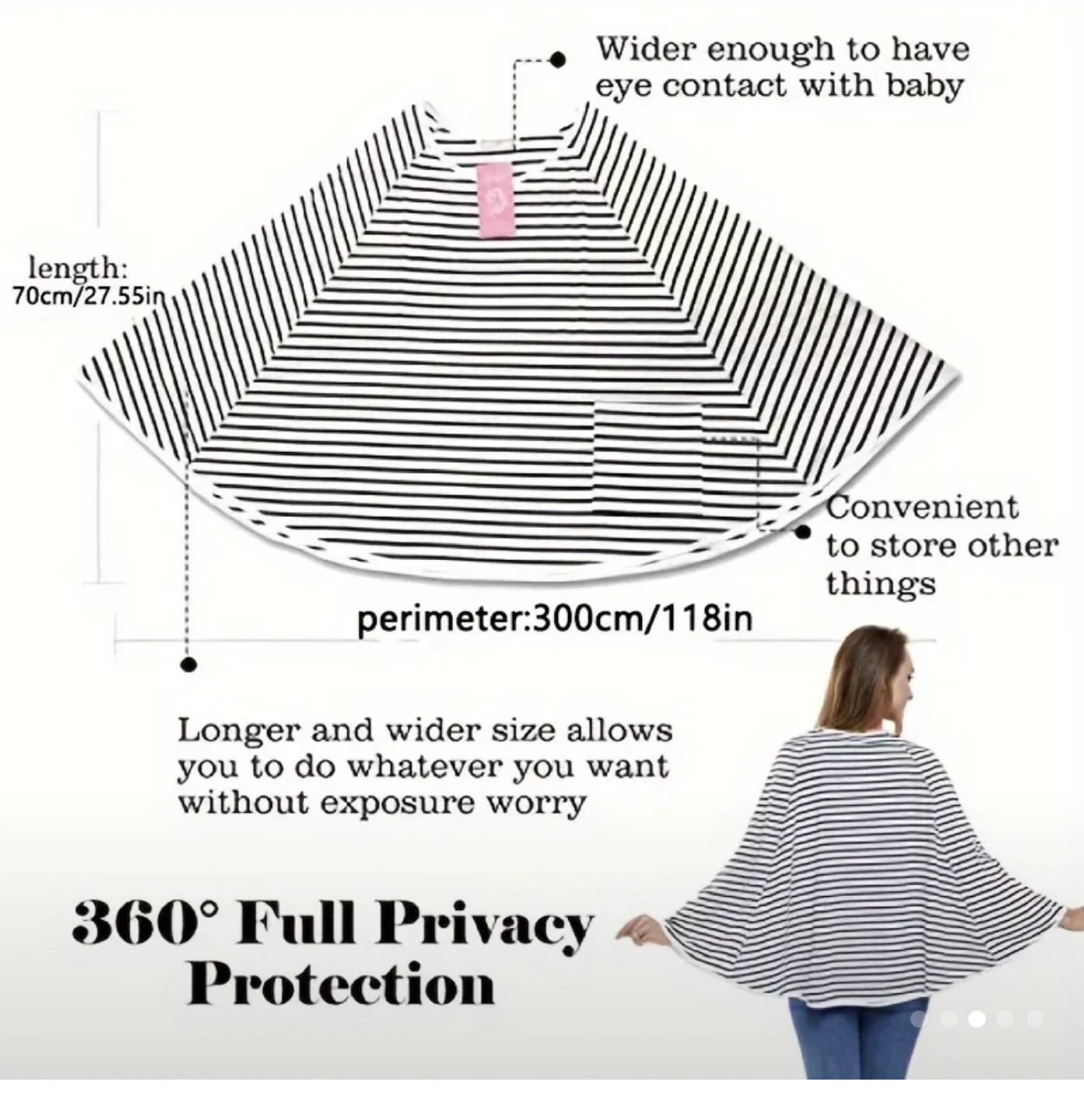 Multi-purpose nursing cover. Black and white striped design. Soft and stretchy fabric. Covers stroller, car seat, baby carrier, high chair, and shopping cart. 360° privacy. Convenient pocket. Milk cotton.