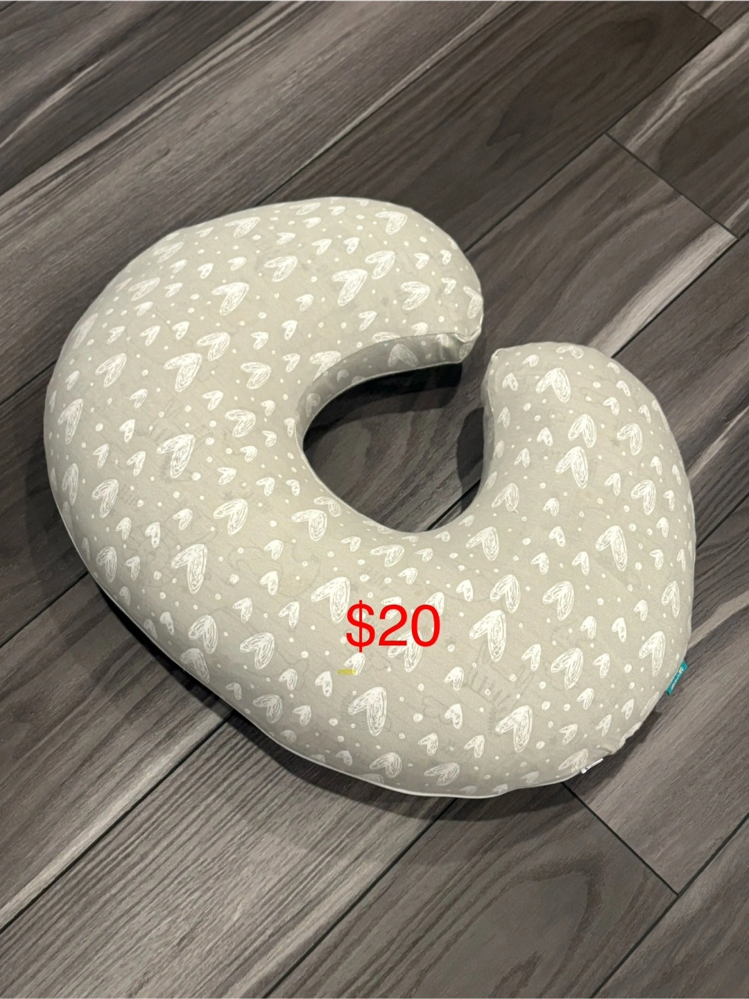 A comfy nursing pillow with a cute grey and white heart pattern! Perfect for supporting your little one during feeding time. It's in great condition and ready for a new home