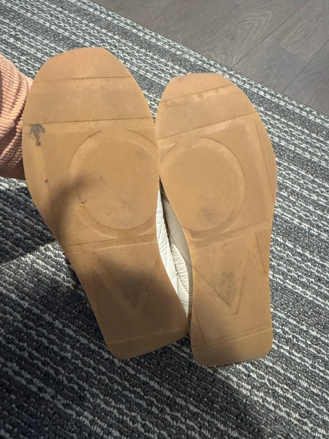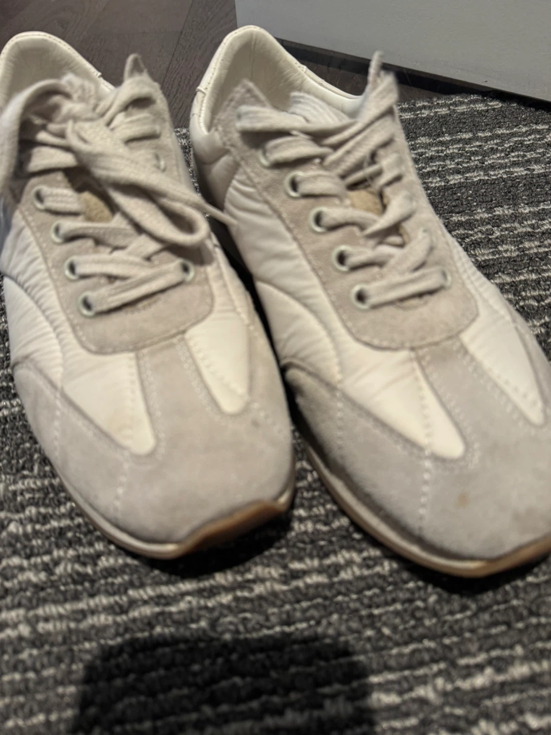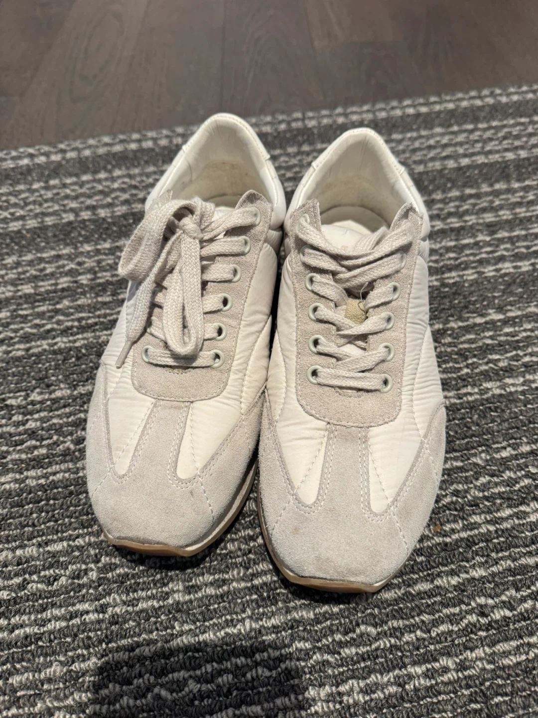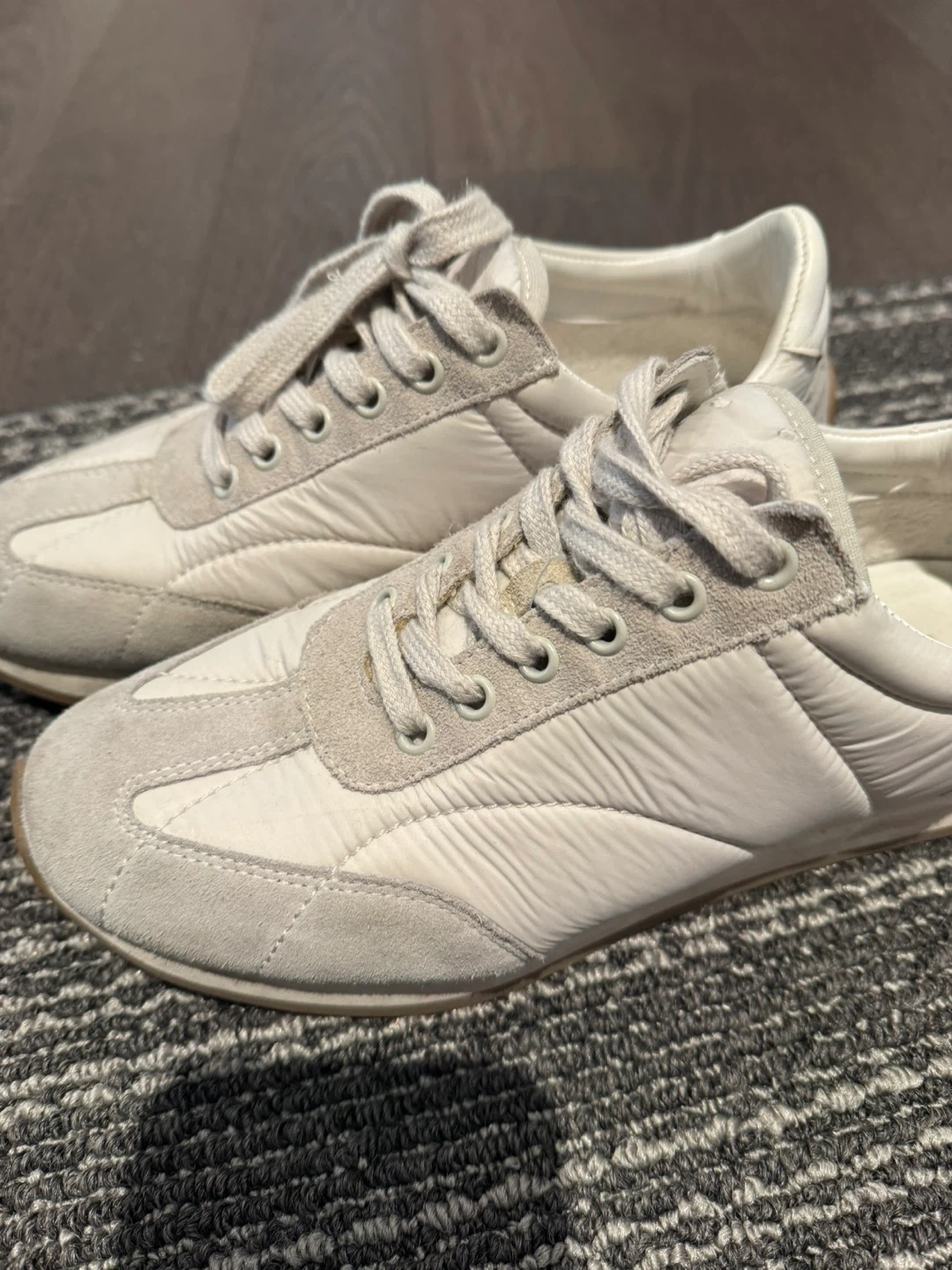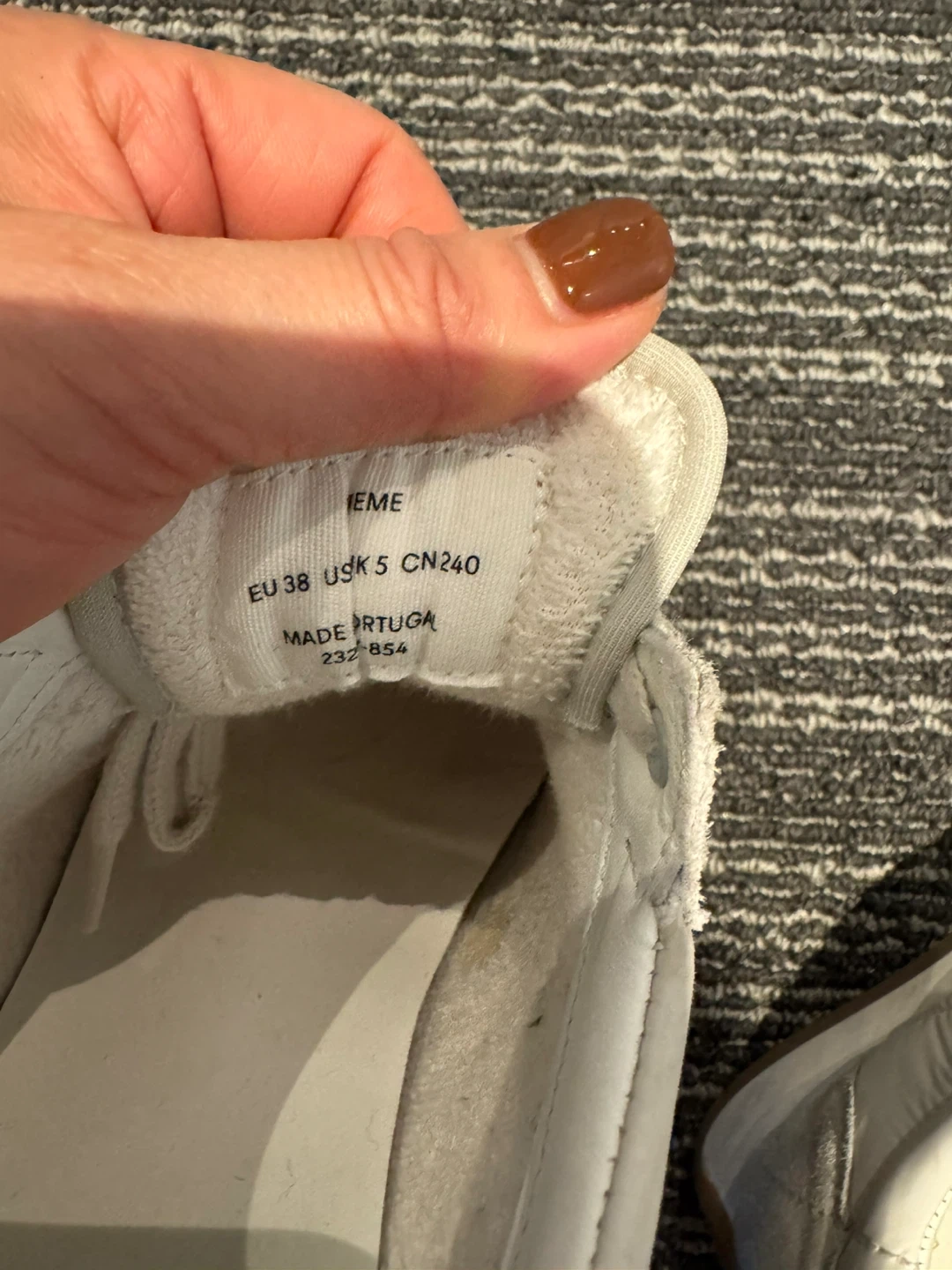 These are white "TOTEME" brand sneakers. They're made in Portugal and are a size EU 38, USK 5, CN 240. They feature a combination of nylon and suede materials.