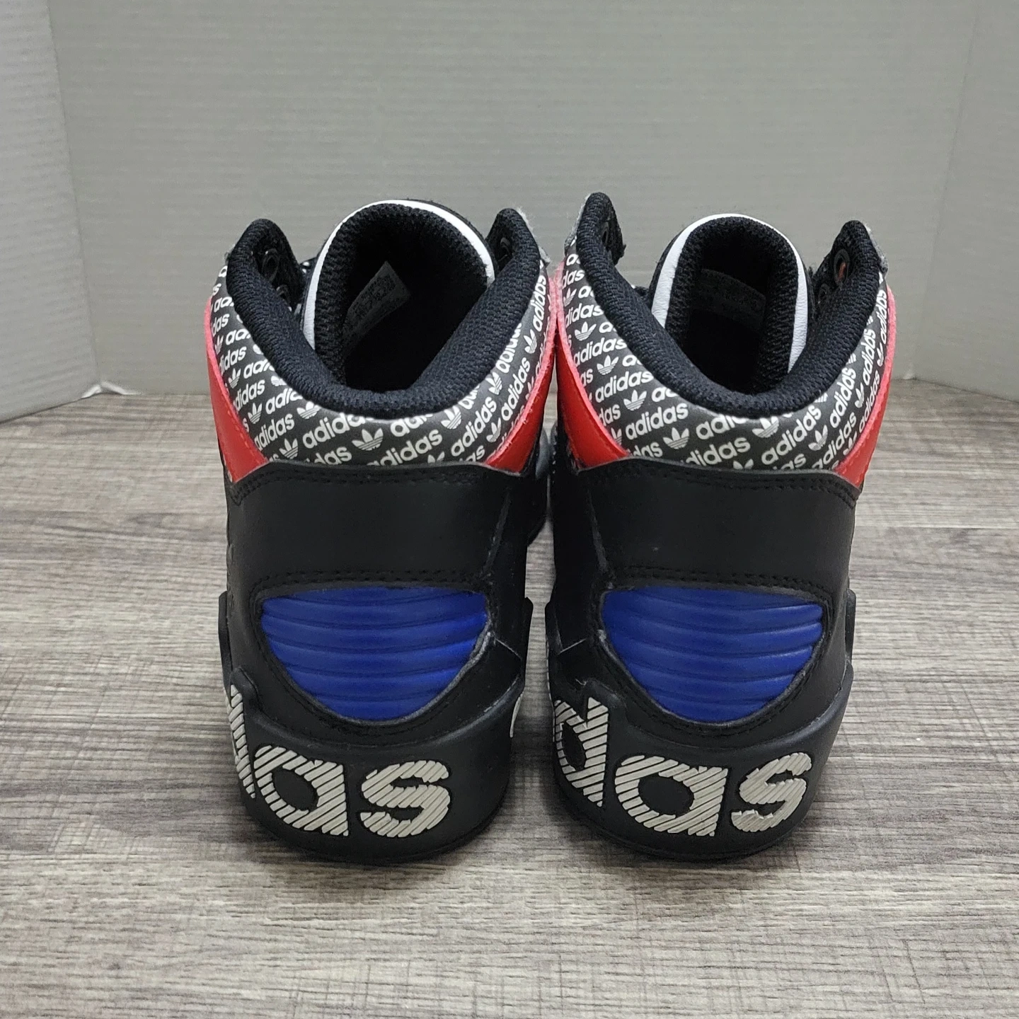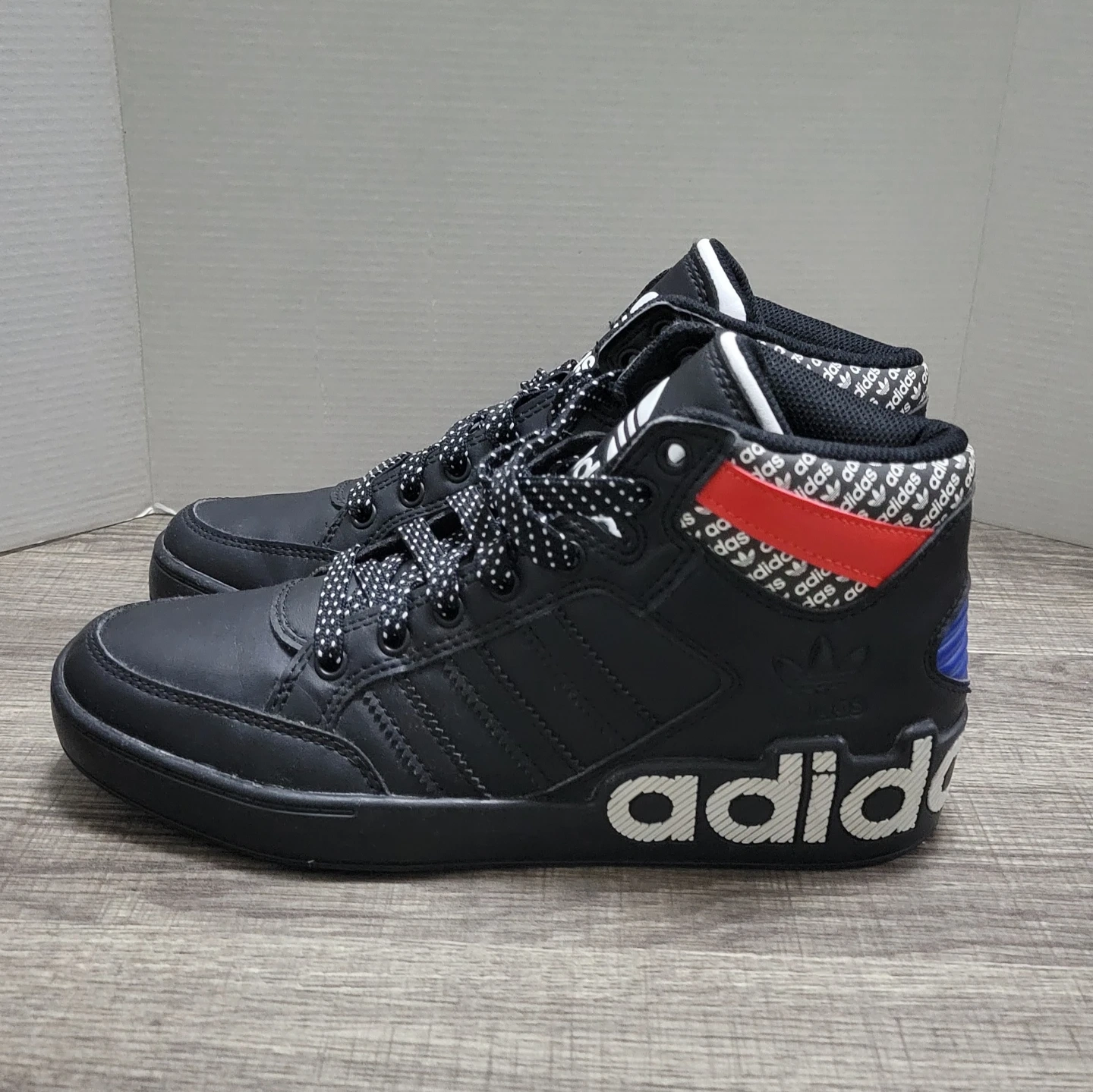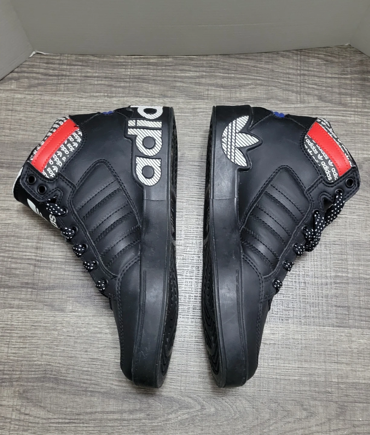 Black Adidas high top sneakers with red and blue accents. Features white laces and logo details.