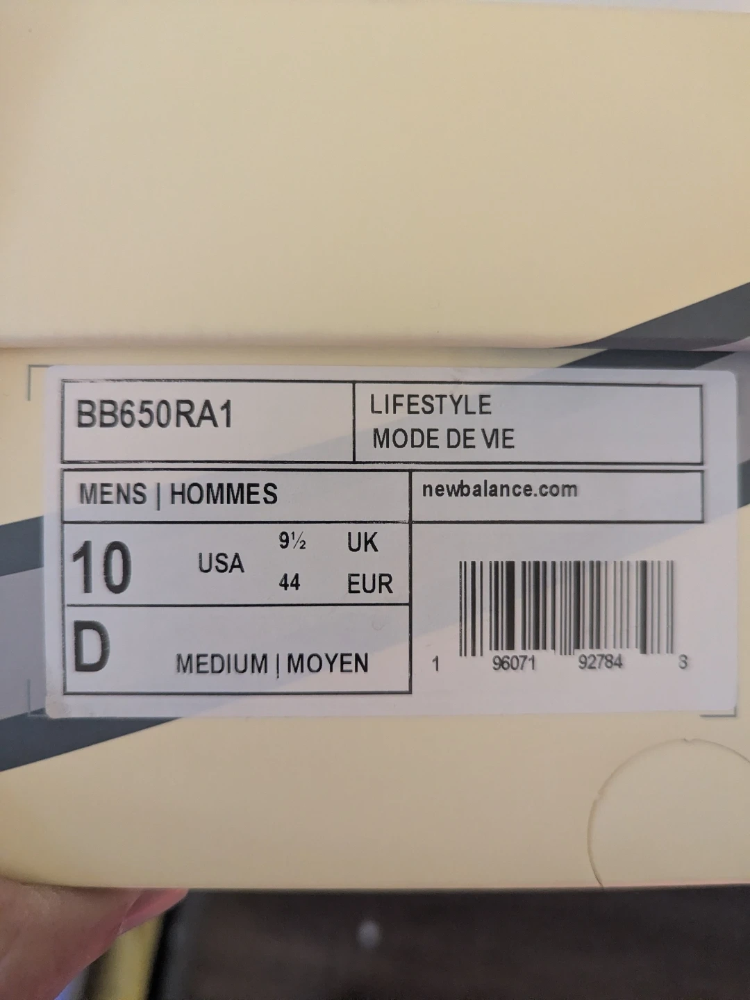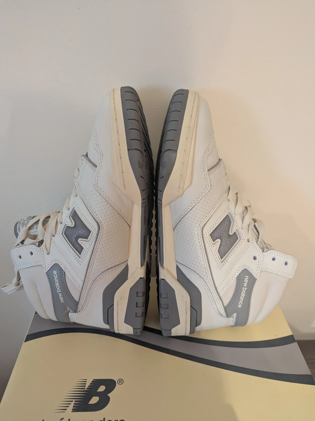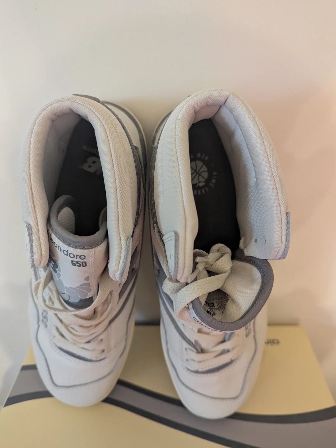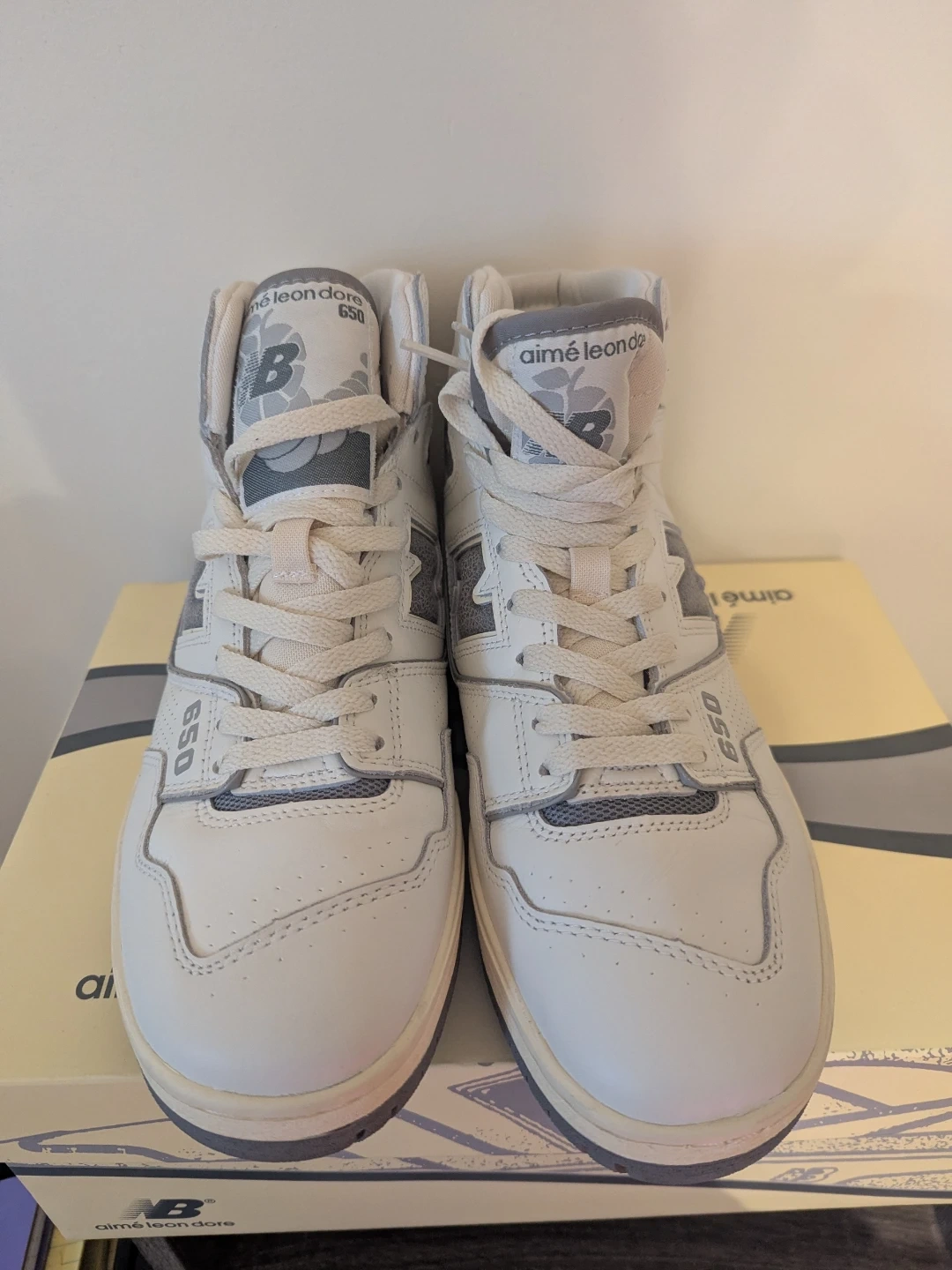 A pair of New Balance Aimé Leon Dore 650 high-top sneakers in white and grey. These shoes feature a leather and textile construction with a rubber sole. They come with the original box.