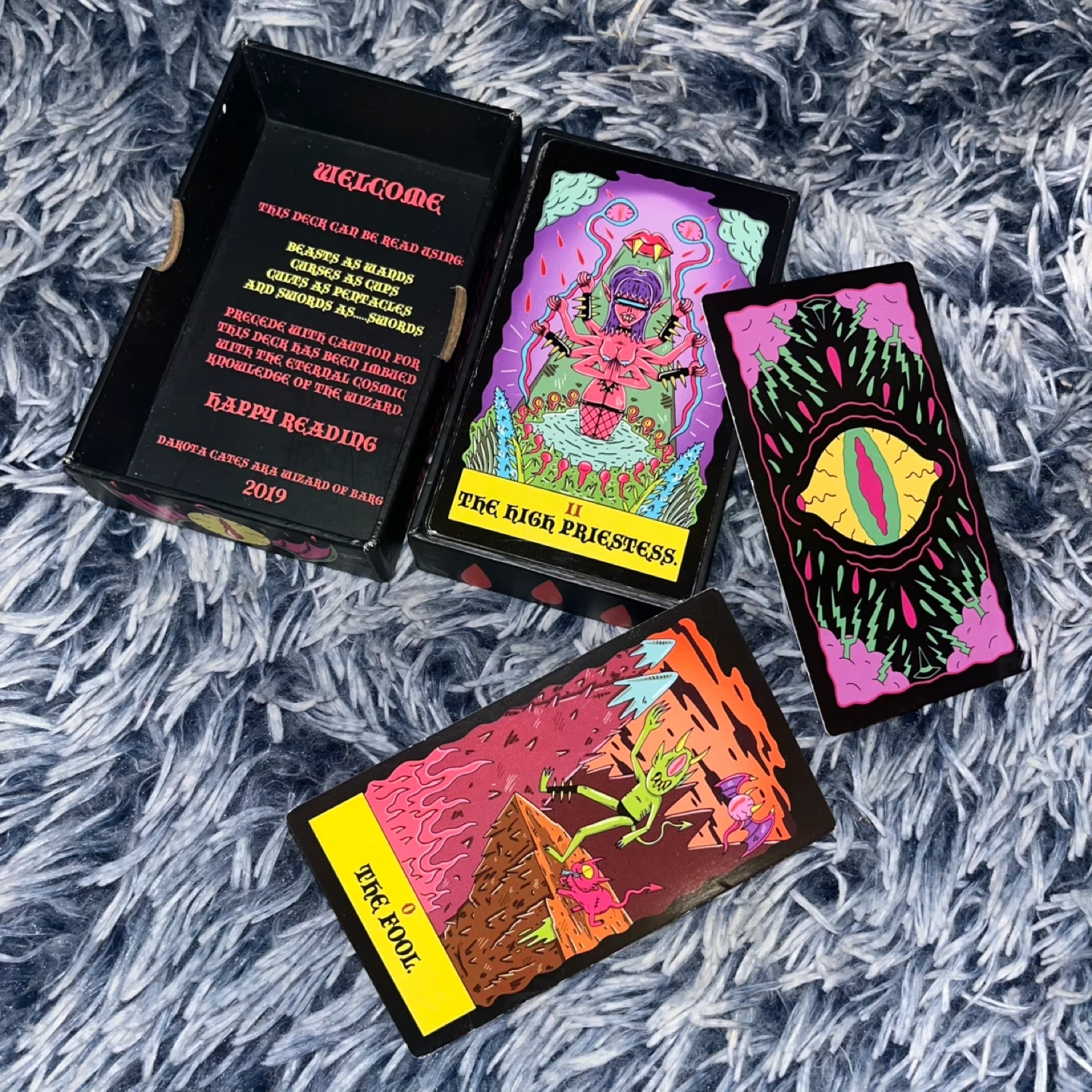 This deck is the Wizard's Tarot. It includes cards and a box. This tarot deck does not come with a guidebook. There are trusted sites such as Biddy Tarot that will help with detailed interpretations.