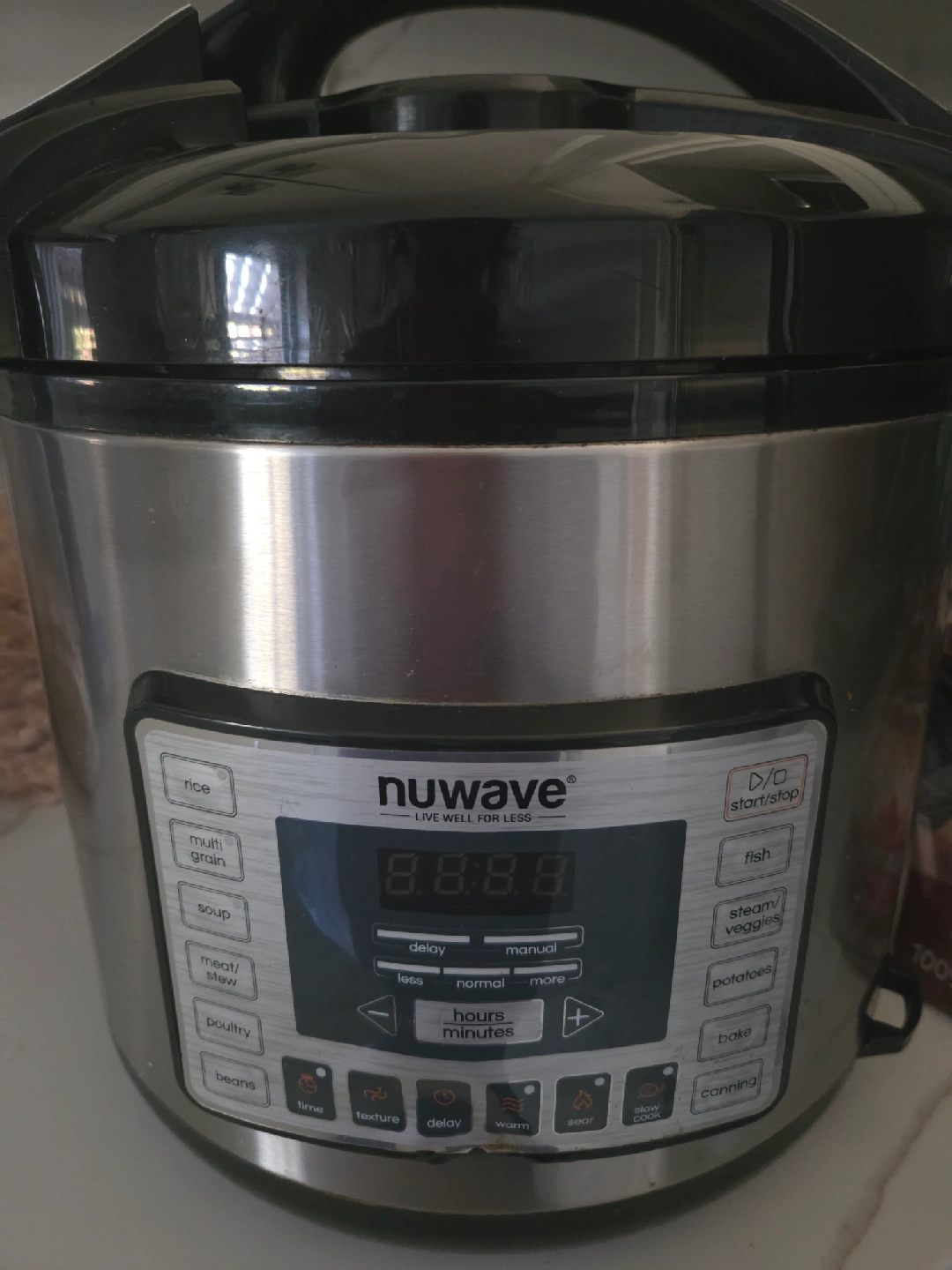 Selling a NuWave electric pressure cooker. It has settings for rice, multi grain, soup, meat/stew, poultry, beans, fish, steam/veggies, potatoes, bake, and canning. It also has settings for texture, delay, warm, and sear. It takes a bit longer to heat up though been using it for a while now.