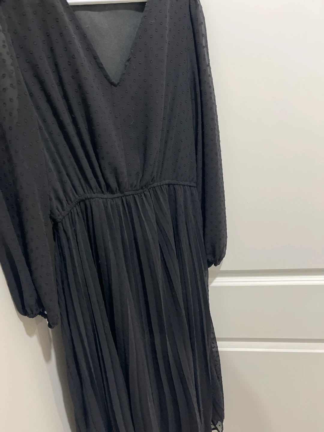 This is a black chiffon dress with a V-neck and long sleeves. It features a shirred waist and a pleated skirt. The fabric has a subtle textured dot pattern.