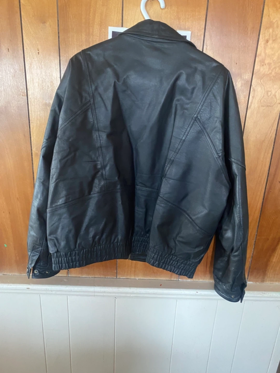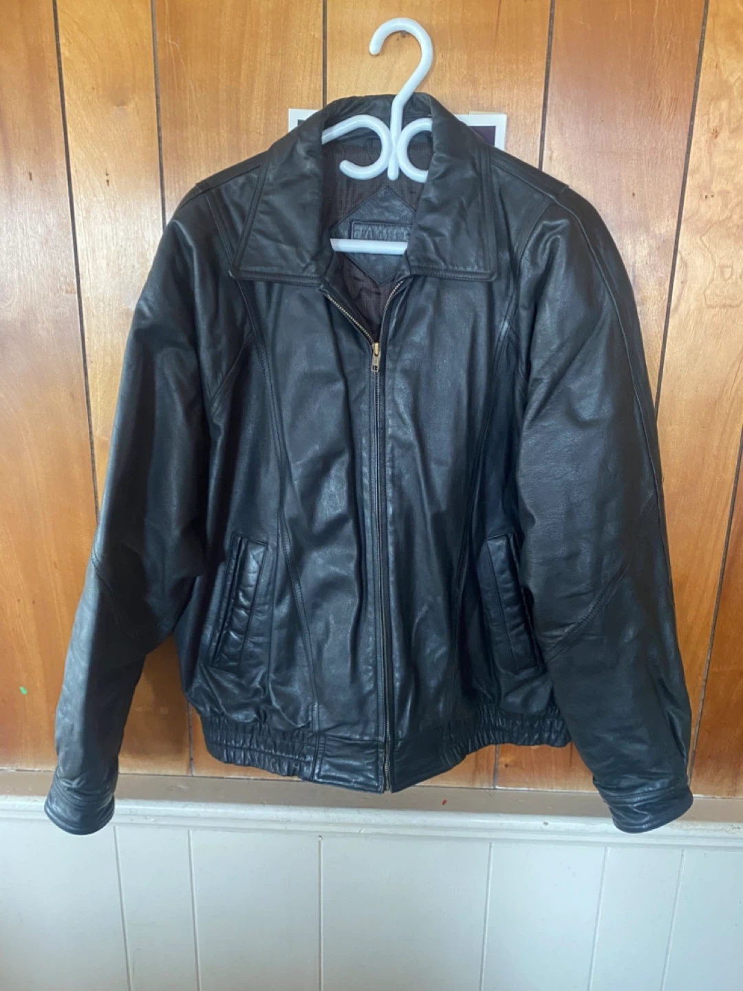 A classic black genuine leather jacket. It features a quilted lining and a zipper closure. Size is L/G.