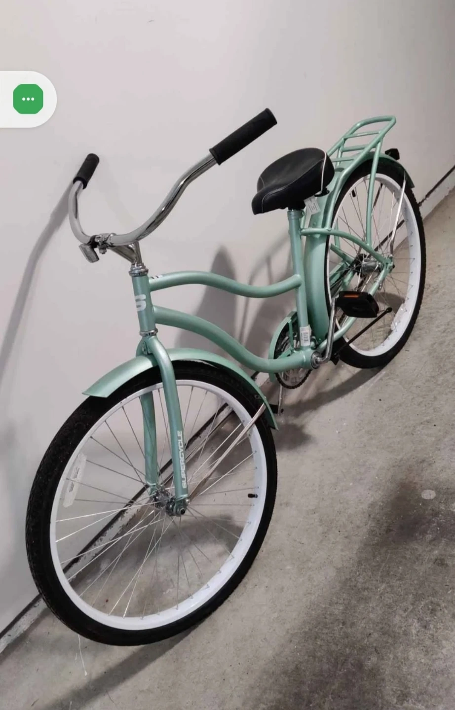 This Supercycle cruiser bike is a lovely mint green colour. It features a comfortable seat and a rear rack for carrying belongings. Perfect for leisurely rides around town!
