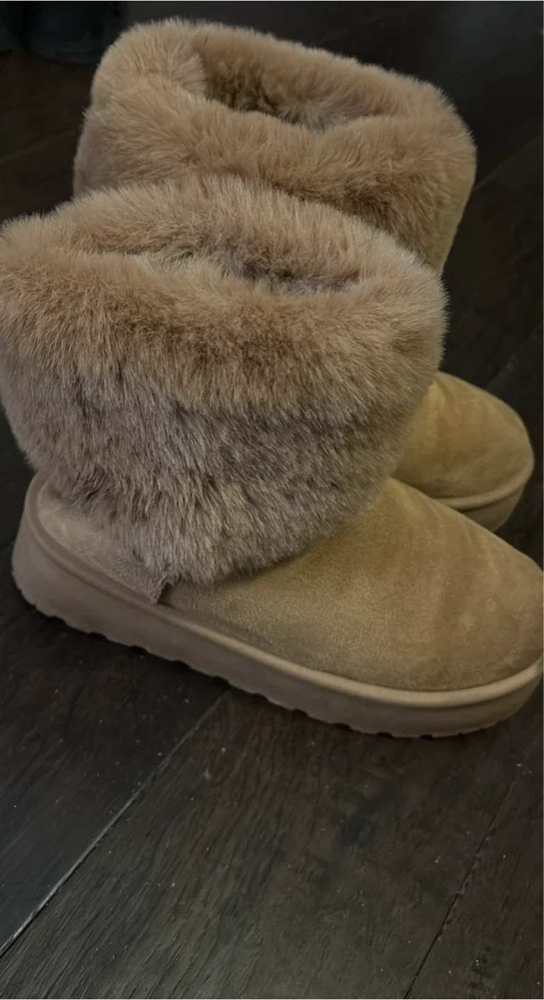 Cozy tan suede boots featuring a fluffy fur trim. These boots have a durable sole and a comfortable fit. Perfect for keeping your feet warm on chilly days!