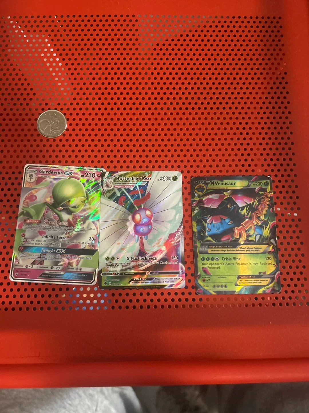 Three Pokemon trading cards are included: Gardevoir GX, Butterfree VMAX, and Mega Venusaur. These are collectible cards for fans of the Pokemon franchise. You can buy them together or each