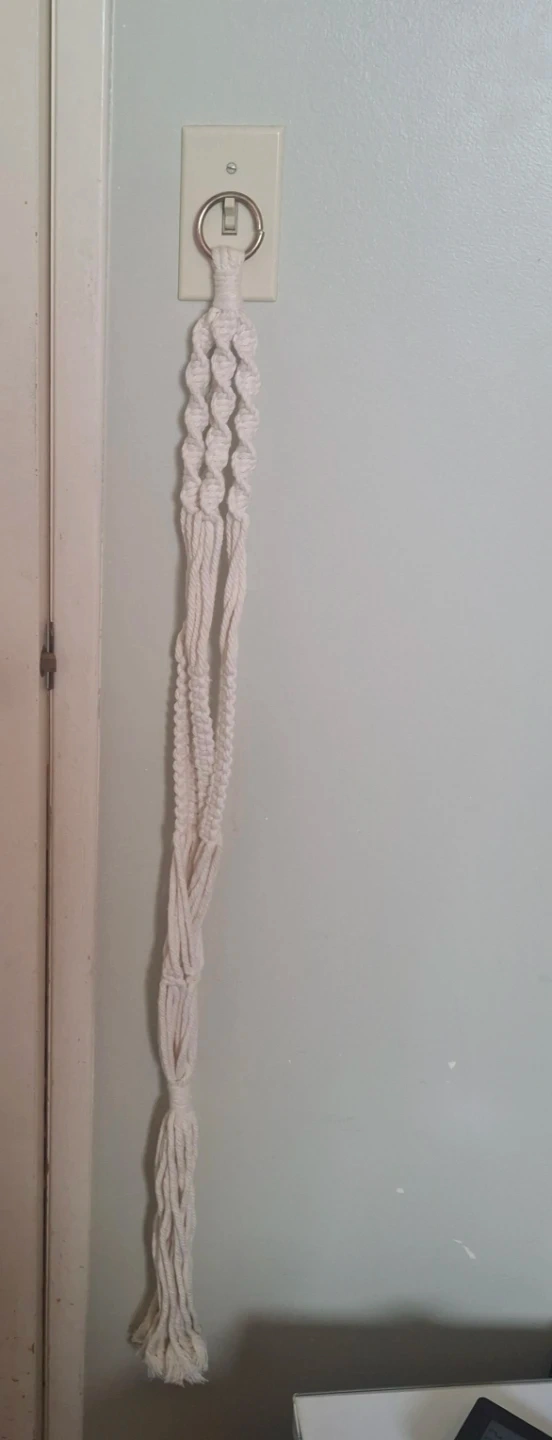 This is a handmade macrame plant hanger. It's made of cream cotton rope and features a metal ring for hanging. It's designed to hold potted plants.