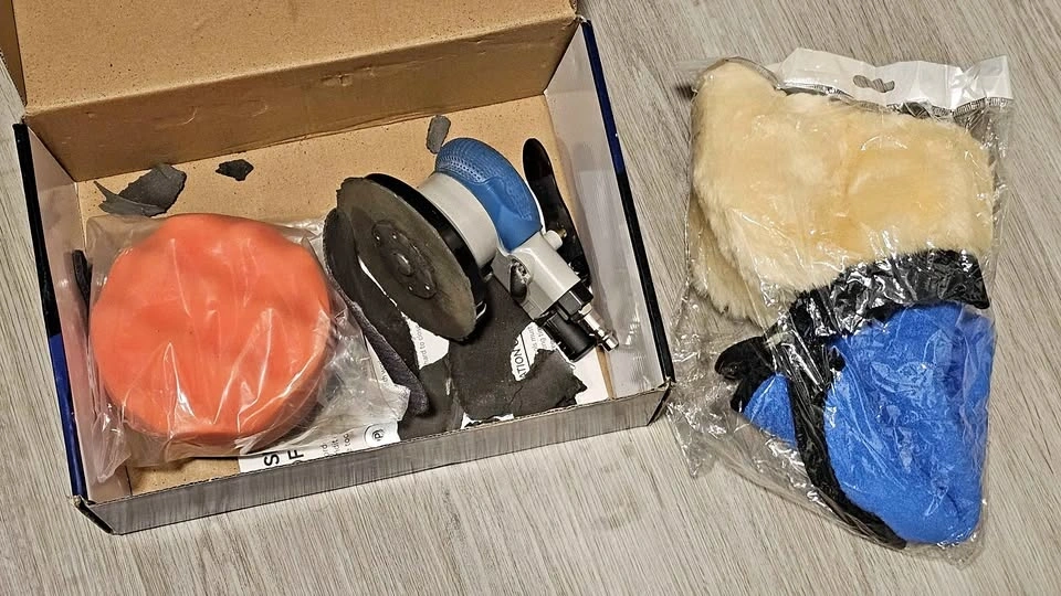Versatile KUIIMT pneumatic orbital sander kit. Comes with an air-powered sander, an orange foam pad in a bag, and a wool buffing pad in a bag. Good for car detailing or other sanding/polishing projects. Missing part see in photos.