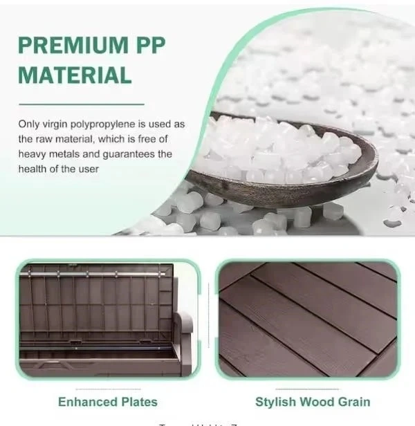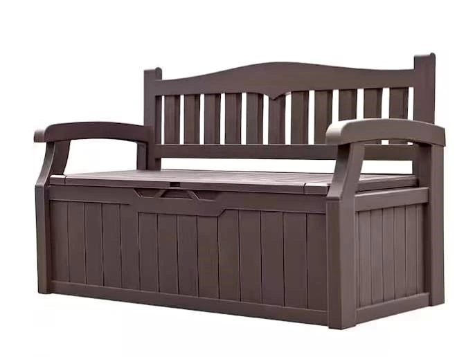 This outdoor storage bench features an 80-gallon hidden compartment for ample storage. It comfortably seats 2-3 people with a weight capacity of 550 lbs. The backrest and armrests enhance user comfort. Constructed from weather-resistant polypropylene, it withstands rust, water, and UV rays. The bench can be locked for added security, keeping your belongings safe. A padlock is required for locking (not included). Its design complements various outdoor settings.