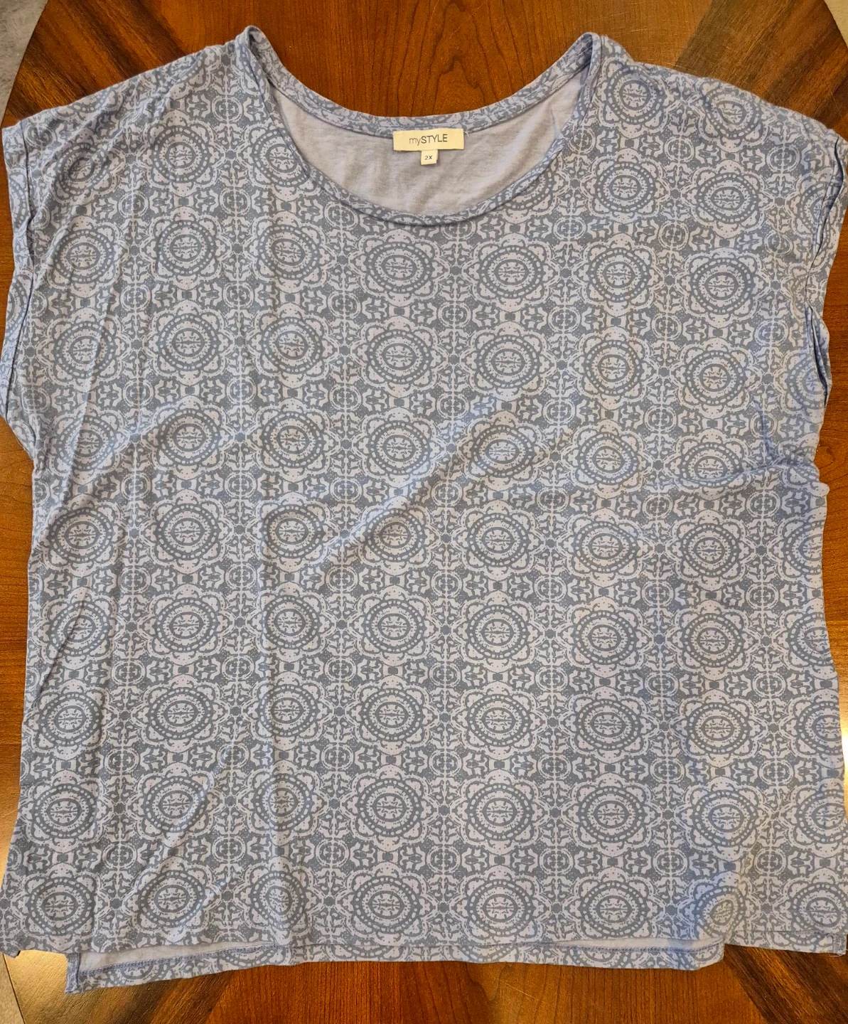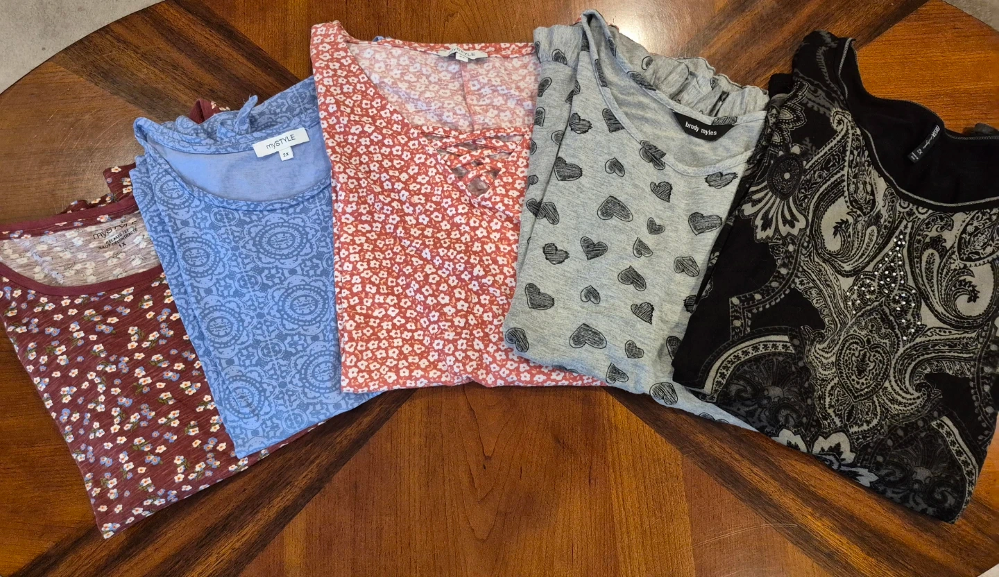 Bundle of 5 women's tops in various prints and colours. Three tops are MyStyle brand; one is 1X and two are 2X. The other two tops were purchased at Winners, one is Brody Myles in 2X grey with hearts and frill bottom and the other is also 2X from Edista and has 3/4 sleeves in black with an intricate front pattern and a bit of bling. Material ranges in cotton, polyester, modal, spandex. Selling $2 each or all five for $10. Smoke-free home. Washed and clean, no stains. Thanks. Will only post for one week and if no interest they will go for donation.