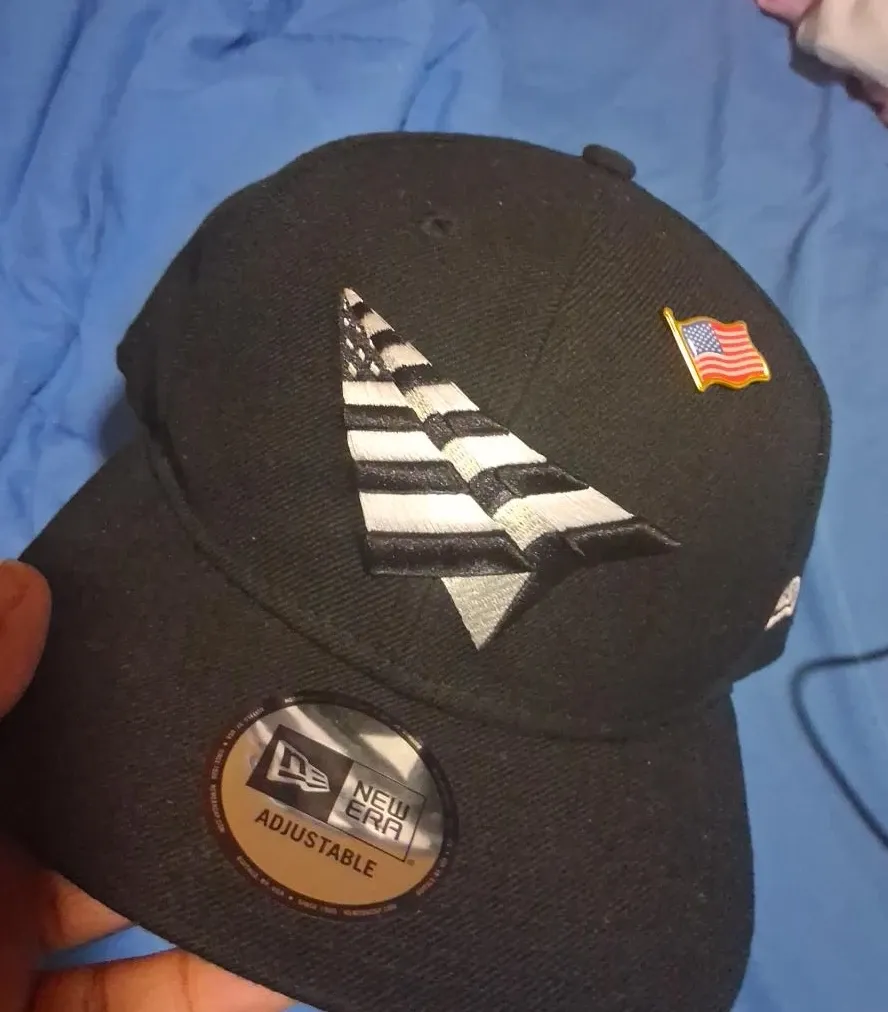 Selling a black New Era adjustable hat. It features a unique paper airplane design and an American flag pin. Great condition!