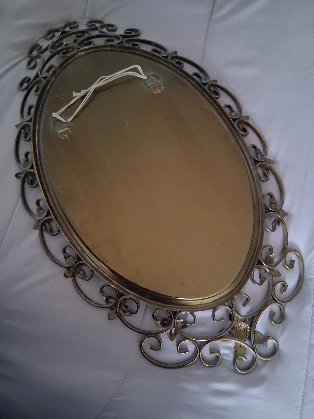 This oval wall mirror features a decorative metal frame with intricate floral and scrollwork details. It's perfect for adding a touch of vintage charm to any room. The frame has a distressed gold and bronze finish. May be brass.